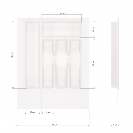 Изделие с легкостью можно вырезать под размеры вашего кухонного ящика, поэтому он универсален! Поверхность лотка гладкая, поэтому он неприхотлив в уходе. Лоток для столовых приборов изготовлен из прочного и высококачественного пластика.