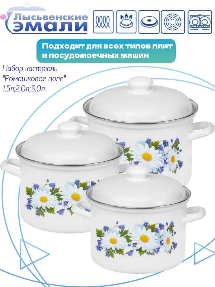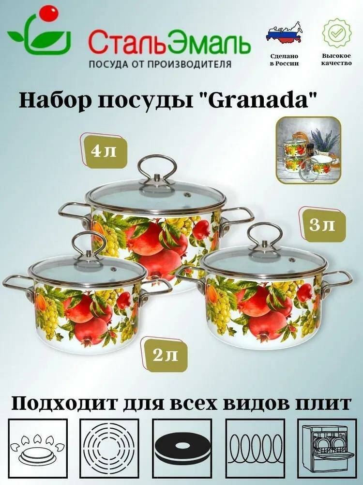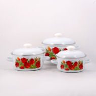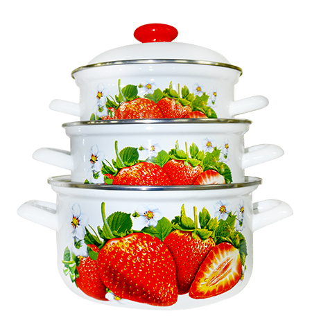 Набор их трёх цилиндрических кастрюль с высоким корпусом,из высококачественного стального проката, покрытого двумя слоями жаропрочной эмали. Эмалевое покрытие на основе силикатных фритт, являясь стекольной массой, не вступает во взаимодействие с продуктами, не искажает их вкусовые качества, не окисляется, при нагревании не выделяет опасные для здоровья человека соединения. Многослойное эмалевое покрытие практично, долговечно и устойчиво к появлению царапин и сколов. Прочный металлический корпус не деформируется в процессе эксплуатации и гарантирует эффективную тепловую обработку пищи.Эмалированная посуда подходит для кухонных плит любого типа, в том числе индукционных, а так же для использования в посудомоечной машине. Эмалевое покрытие наружной поверхности посуды является стойким к прямому контакту с пламенем газовой горелки бытовых газовых плит.
