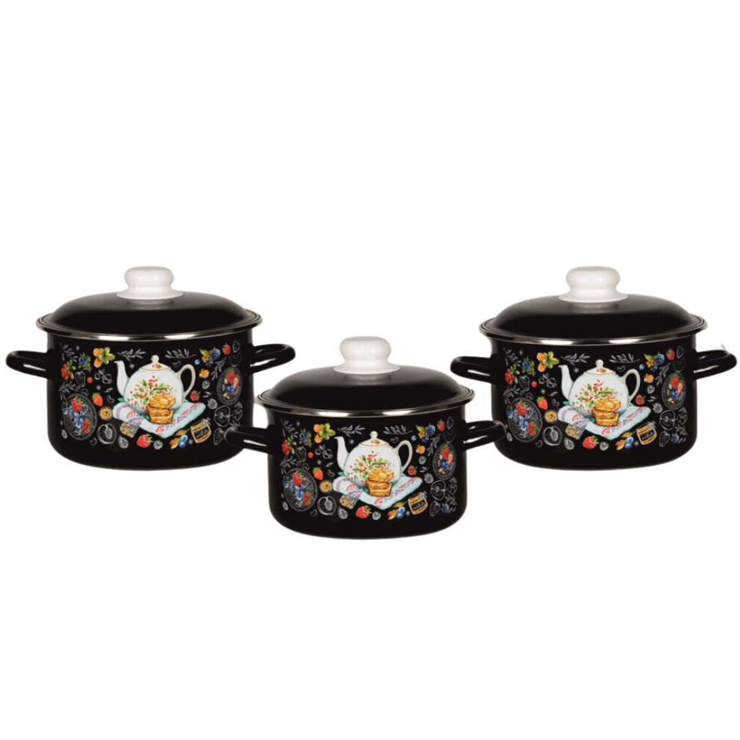 Набор из трех цилиндрических кастрюль.Посуда изготовлена из высококачественного стального проката,покрытого двумя слоями жаропрочной эмали.Борта корпусов и крышек кастрюль защищены нержавеющим ободком.Эмалевое покрытие на основе силикатных фритт,являясь стекольной массой,не вступает во взаимодействие с продуктами,не искажает их вкусовые качества,не окисляется, при нагревании не выделяет опасные для здоровья человека соединения. Многослойное эмалевое покрытие практично, долговечно и устойчиво к появлению царапин и сколов.Прочный металлический корпус не деформируется в процессе эксплуатации и гарантирует эффективную тепловую обработку пищи.Каждое изделие имеет маркировку и аннотацию с правилами эксплуатации и ухода, при выполнении которых изделие сохранит все преимущества, присущие стальной эмалированной посуде. Набор из цилиндрических кастрюль станет отличным подарком для любителей готовить, а также для тех, кто только начинает осваивать кулинарию.