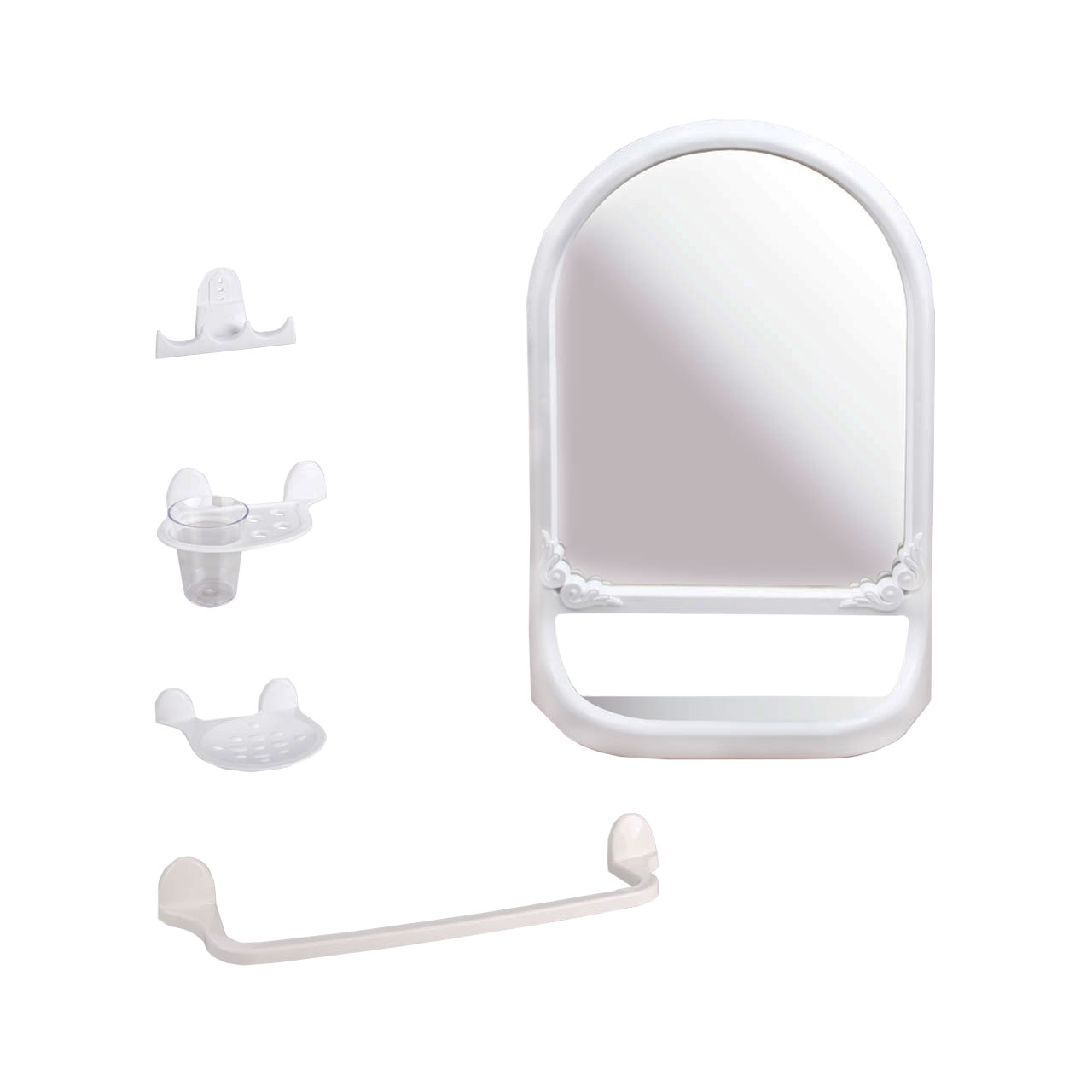 Набор для ванной «Аква» № 5 включает в себя: зеркало с полкой, подставка для зубных принадлежностей, стакан для зубных щеток и зубной пасты, мыльница на присосках, трехрожковый крючок, держатель для полотенца. Изделия изготовлены из высококачественного полипропилена. Набор выполнен в белом цвете, который идеально подойдёт под любой интерьер ванной комнаты. В комплекте есть все необходимые крепежи для прочного крепления на стену.