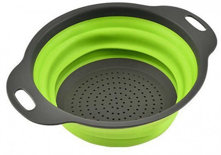 Дуршлаг силиконовый круглый диаметр 24 см с ручками. Оригинальный складной дуршлаг дополнит любую кухню. Он выполнен из прочных и качественных материалов: термопластичный силикон и полипропилена. Функциональный и практичный, с двумя ручками и современным дизайном, силиконовый дуршлаг можно хранить максимально компактно благодаря складной конструкции. Круглый дуршлаг легко моется, занимает мало места на полке или в шкафу. Преимущества: практичный складной дуршлаг; две боковые ручки; экономия пространства для хранения; материал не токсичен; для любых хозяйственных целей; стильный яркий дизайн; температурный режим: до 100 С (возможно использование в посудомоечной машине). Длина с ручками 30 см, ширина/диаметр 24 см, глубина 9,5 см (в собранном виде 5 см).Складной силиконовый дуршлаг станет настоящей находкой, поскольку занимает минимум места и отличается удобством в эксплуатации.