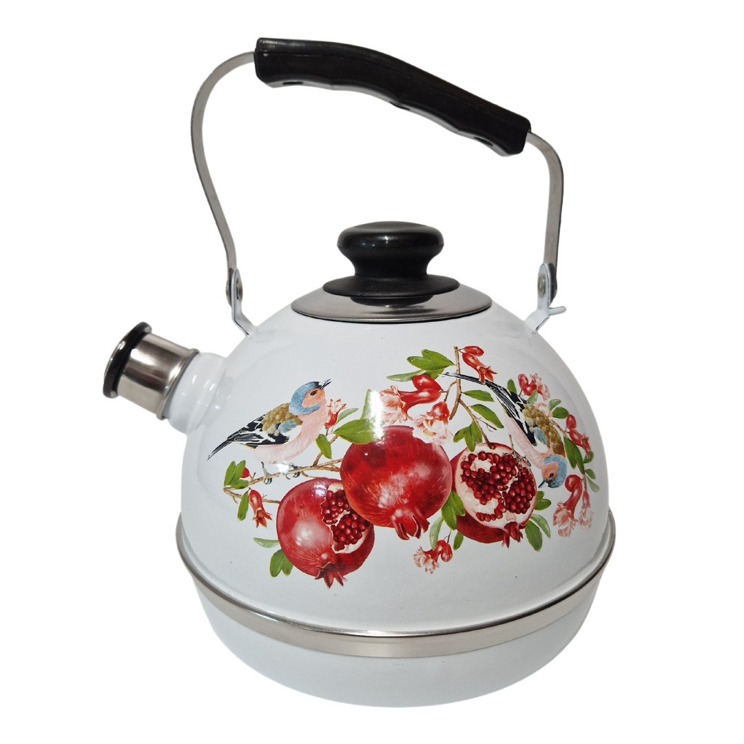 Эмалированный чайник со свистком - это незаменимый помощник на любой кухне. Он изготовлен из качественной эмалированной стали, которая обеспечивает прочность и долговечность. Чайник имеет удобную ручку и крышку. Встроенный свисток предупреждает о закипании воды, что очень удобно и практично. Эмалированное покрытие защищает от коррозии и сохраняет полезные свойства воды. Разнообразие дизайнов и объемов чайника позволяет выбрать подходящий вариант для любой кухни. Чайник эмалированный со свистком. Подходит для всех видов плит: газовые, индукционные, электрические, стекло-керамические. Внешнее трехслойное эмалевое покрытие не вступает во взаимодействие с пищевыми продуктами, защищает сталь от коррозии, придает посуде гладкую стекловидную поверхность, устойчива к высоким температурам и надежно защищает от кислот и щелочей. Материал чайника - высококачественная нержавеющая сталь. Изделие произведено в России. Свисток съемный из нержавеющей стали. Крышка плотно прилегает к краю, позволяющая долго не остывать воде.