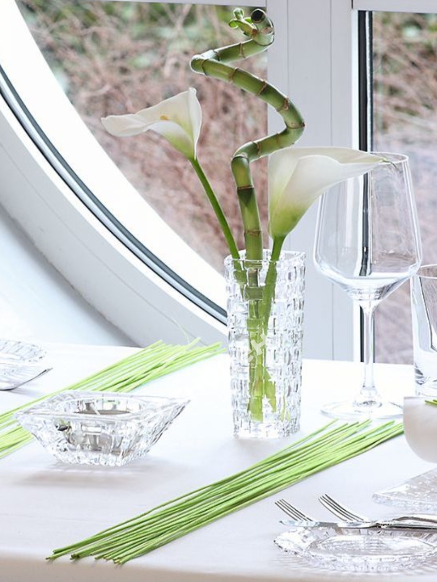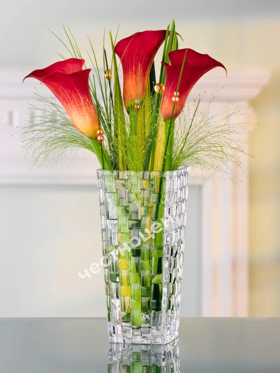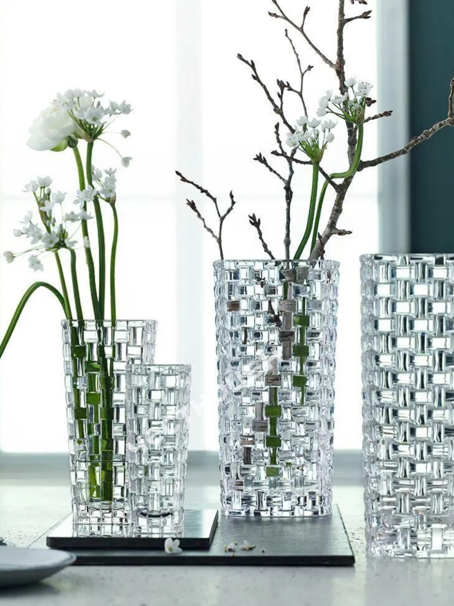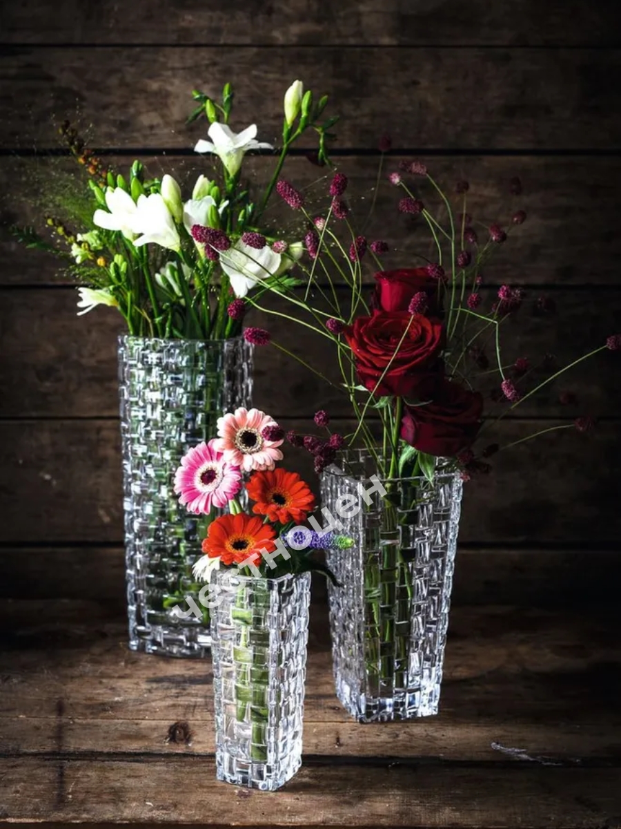 Современная и элегантная ваза для цветов из бессвинцового стекла с оригинальным дизайном из причудливых кристаллов в форме квадратов, создающих плетеный орнамент, прекрасно впишется в любой интерьер дома.