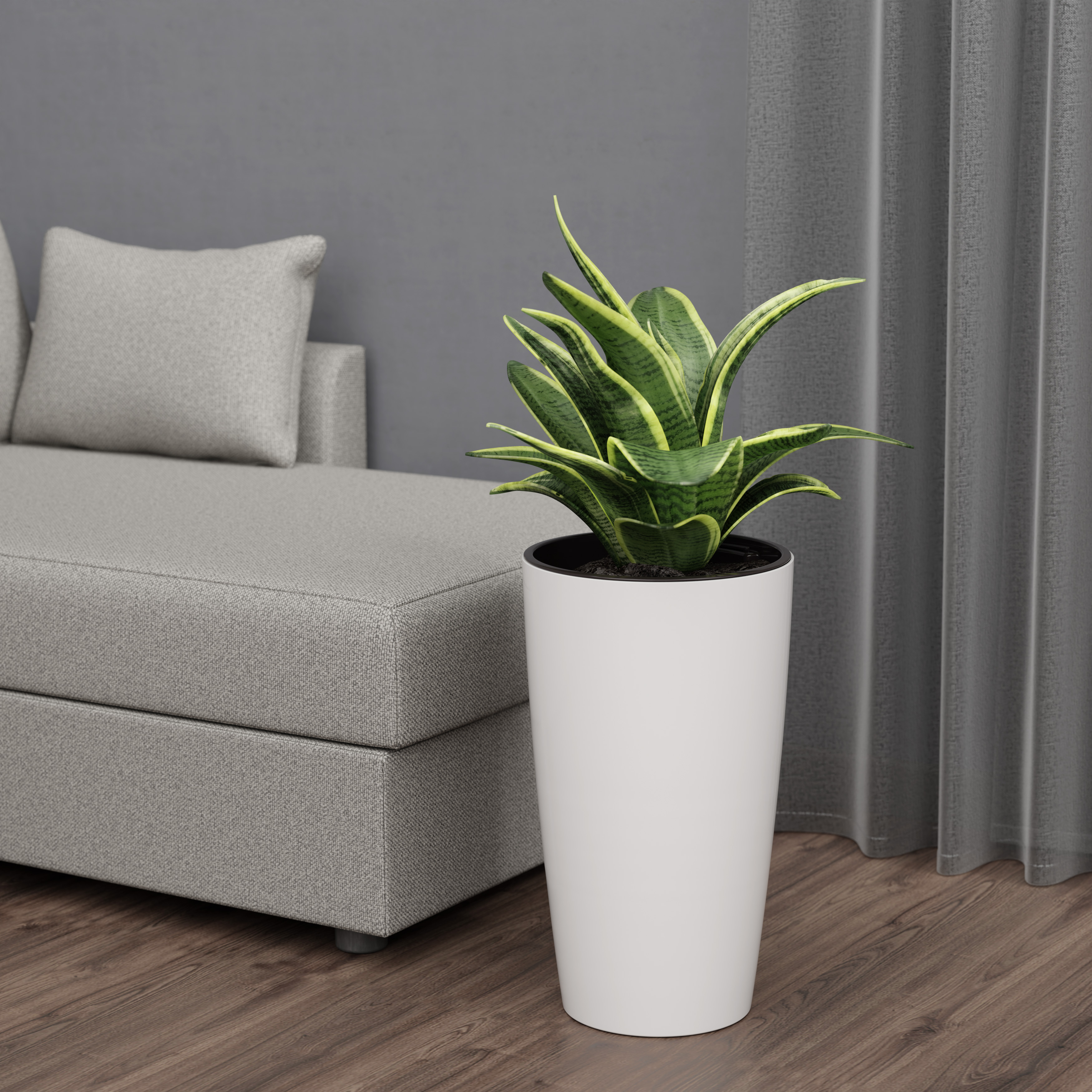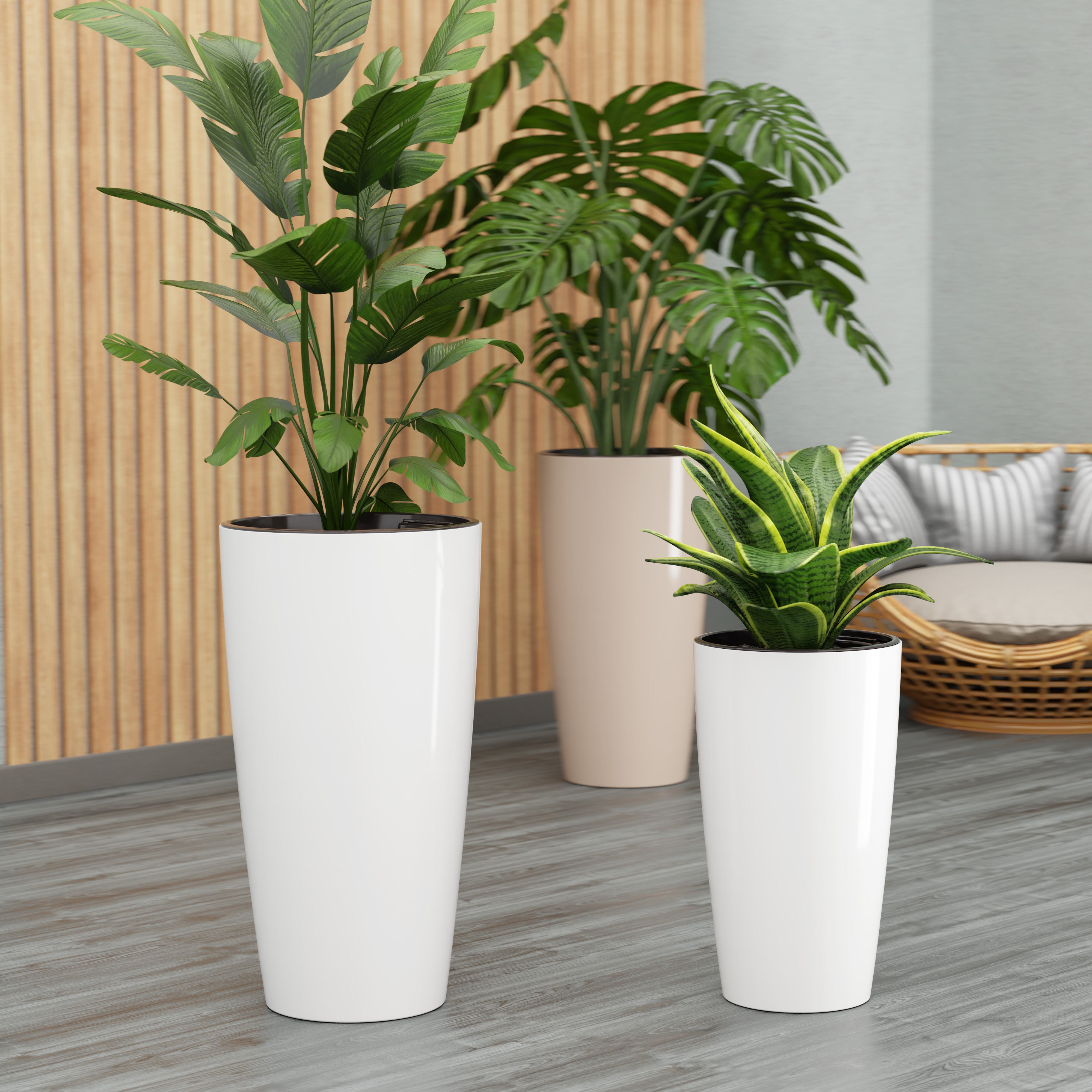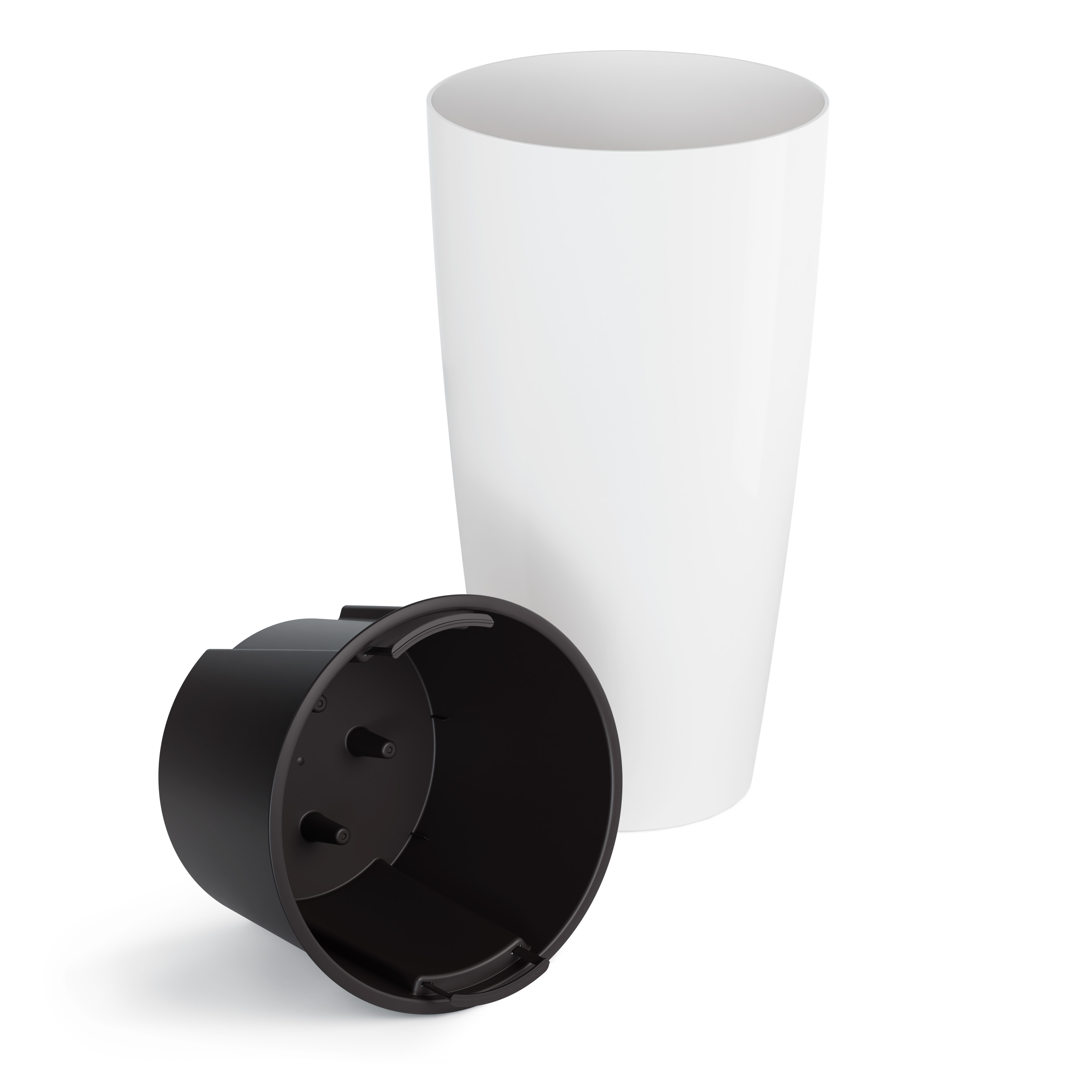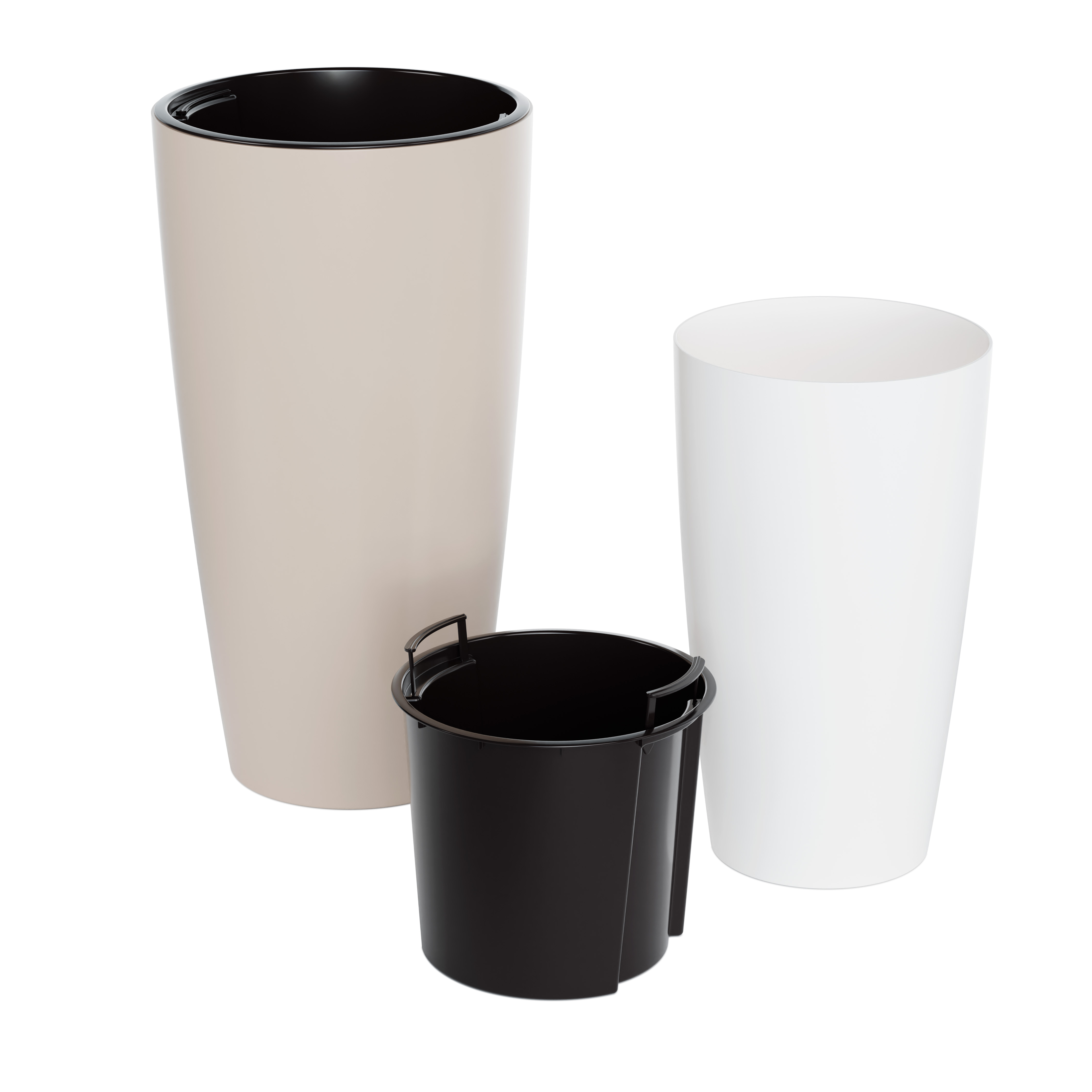 Состоит из внутренней вставки и горшка. Дно вставки оснащено высокими столбиками с отверстиями, благодаря которым лишняя вода не задерживается и корневая система цветка не портится. Практичные выдвижные ручки обеспечивают удобство при пересадке, переноске и уходе за растениями.