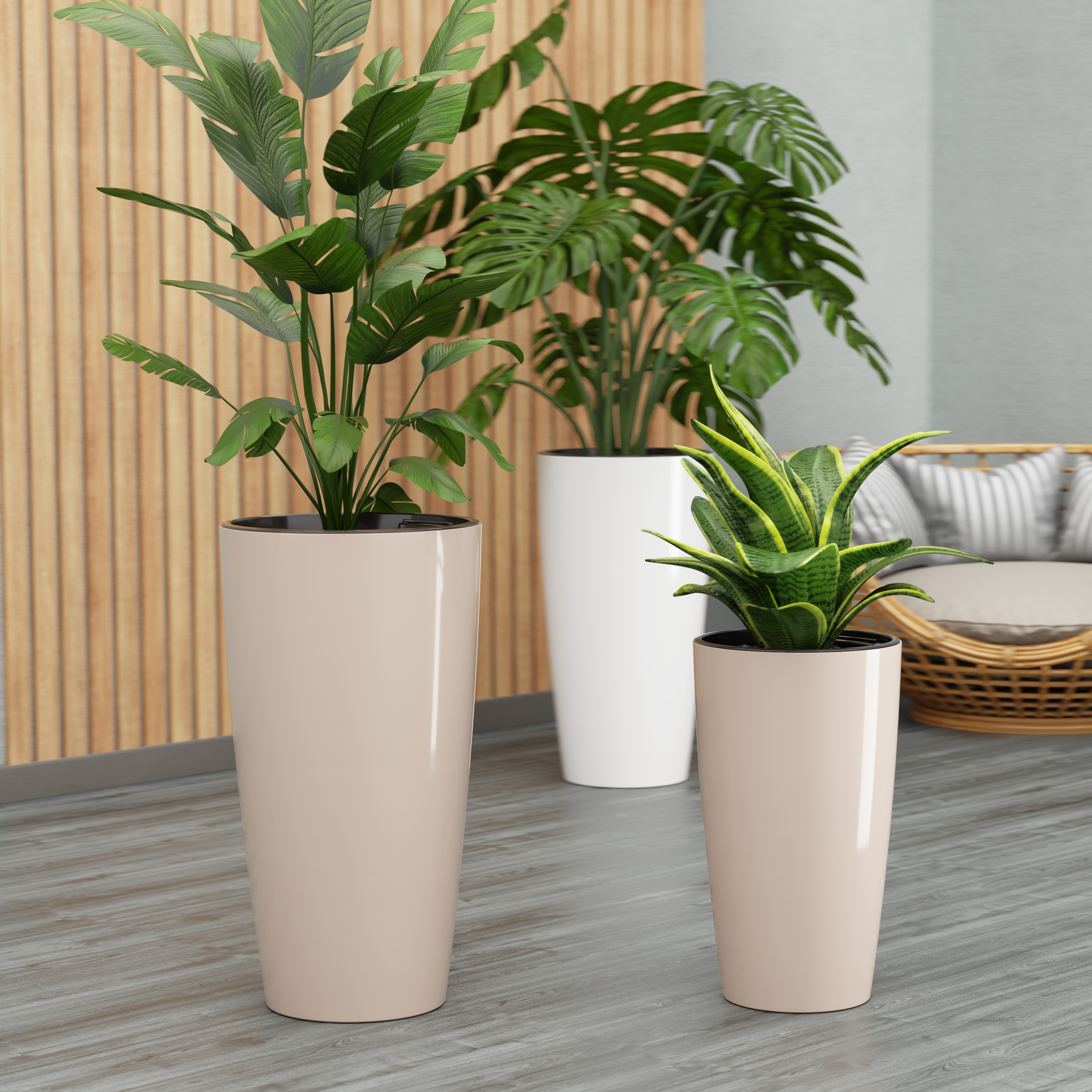 Состоит из внутренней вставки и горшка. Дно вставки оснащено высокими столбиками с отверстиями, благодаря которым лишняя вода не задерживается и корневая система цветка не портится. Практичные выдвижные ручки обеспечивают удобство при пересадке, переноске и уходе за растениями.