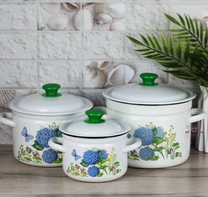 В набор входят три кастрюли с удобными бортами объёмом 2, 4 и 6 литров. Эмалевое покрытие не только придаёт посуде эстетичный вид, но и защищает её от механических повреждений и воздействия пищевых кислот.