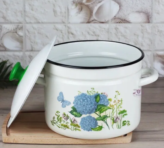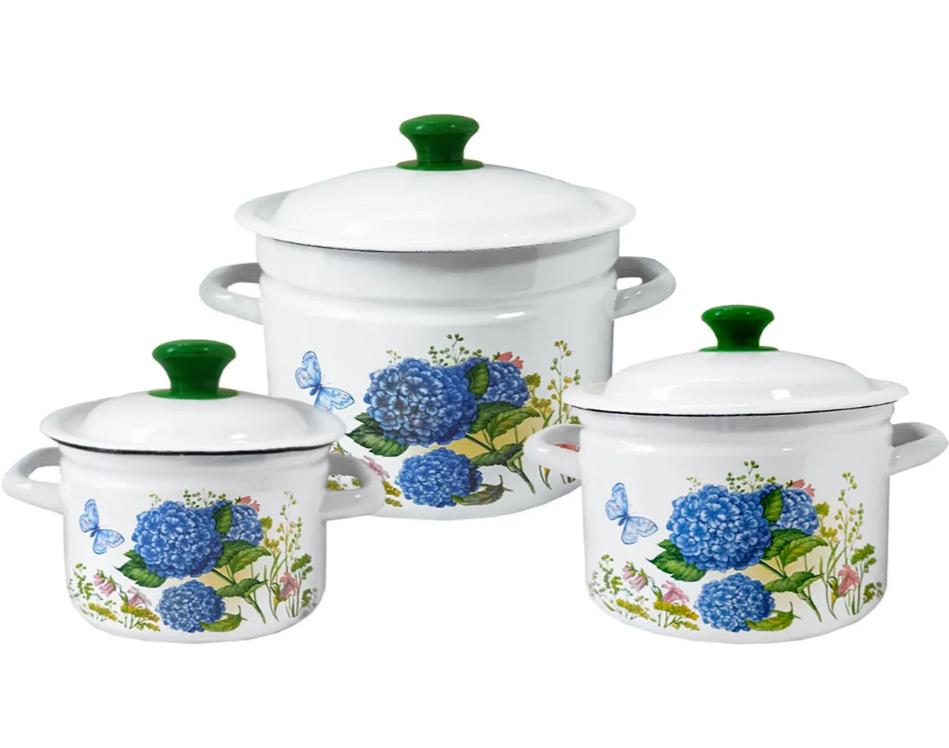 В набор входят три кастрюли с удобными бортами объёмом 2, 4 и 6 литров. Эмалевое покрытие не только придаёт посуде эстетичный вид, но и защищает её от механических повреждений и воздействия пищевых кислот.