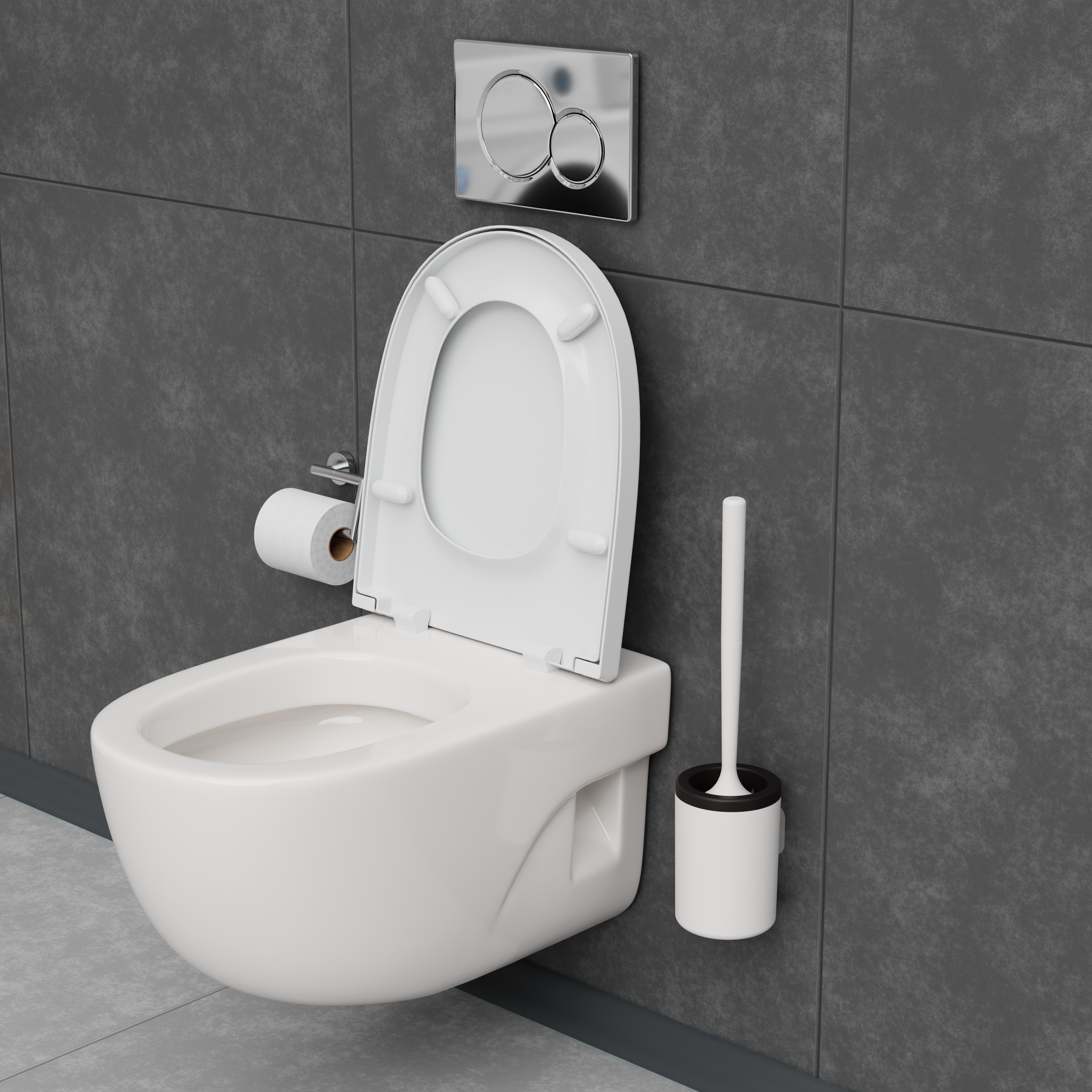 Комплект состоит из ершика с пластиковой рукояткой, щеткой из ТЭПа, стакана со вставкой и крепления на стену.