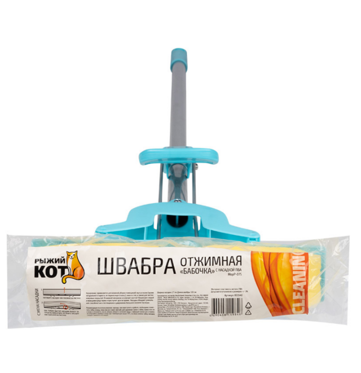 Отжимная швабра Рыжий кот Бабочка MopP-07S 003548 с губчатой насадкой отлично впитывает влагу.