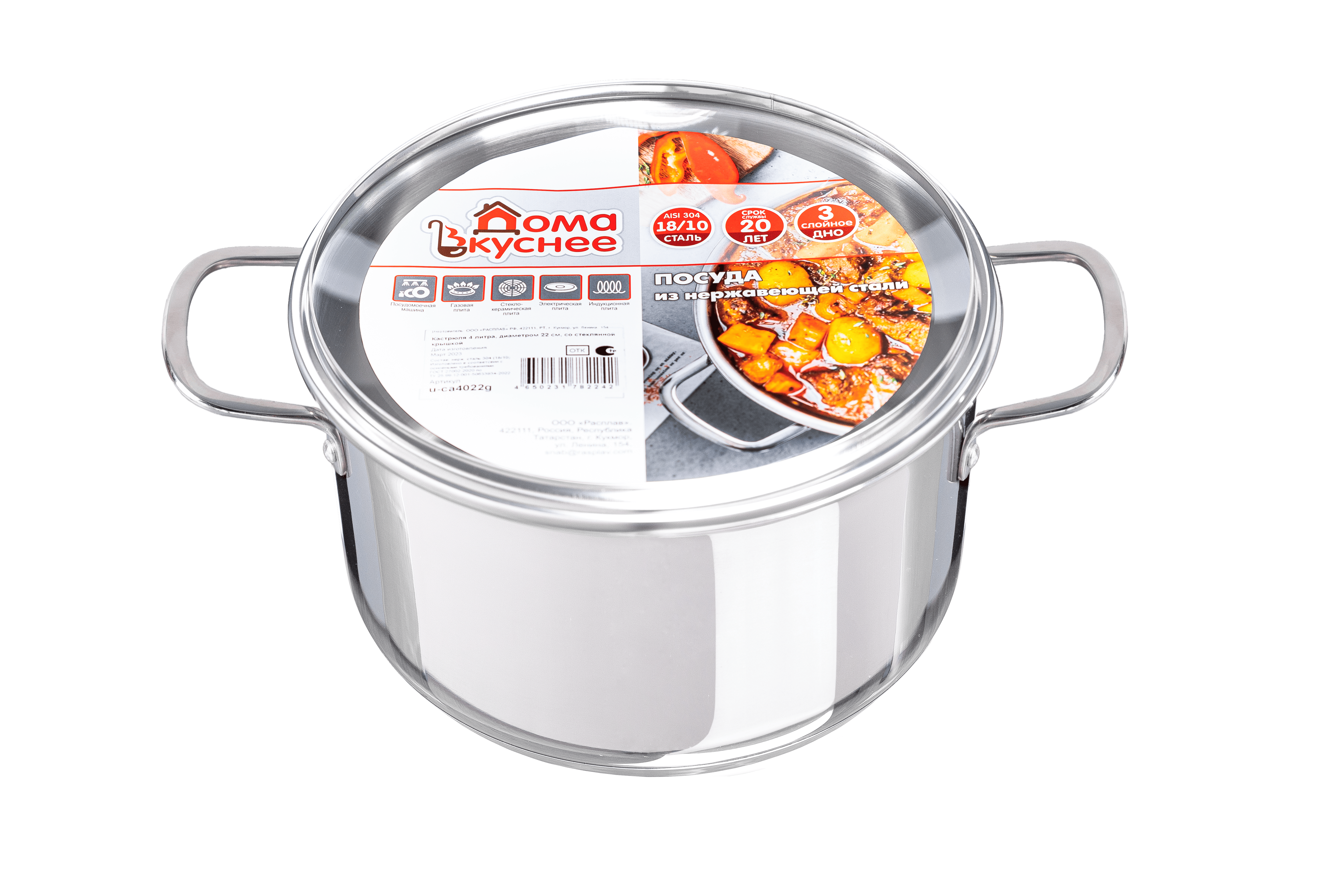Уценённая посуда линия «Дома вкуснее» представляет для покупателей широкий выбор кастрюль, сотейников и сковородок, изготовленных из высококачественной нержавеющей хромоникелевой стали AISI 304 (18/10). Толстое и ударопрочное дно, оснащённое теплораспределительным слоем, эффективно и равномерно распределяет тепло по всей поверхности. Повышенная прочность корпуса, благодаря стенкам толщиной до 0,8мм, обеспечивает долгий срок службы. Вся посуда упакована в термоусадочную плёнку, имеет вкладыш с описанием товара, подробной инструкцией по эксплуатации и комплектуется жаропрочной стеклянной крышкой со стальным ободом. Крышки и ручки, как у линии Orion, плюс на крышке идет нерж. бабышка. Остальные характеристики как у линеек Safia и Leon.