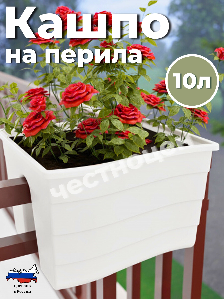 Кашпо легко установить на перила лестниц, ограждения открытых балконов, декоративные стенки. Специальные зажимы позволяют закрепить кашпо на разной ширине перила. Максимальная ширина рейлинга - до 5 см. Дно оснащено столбиками с отверстиями для отвода лишней воды во время дождя или при чрезмерном поливе.