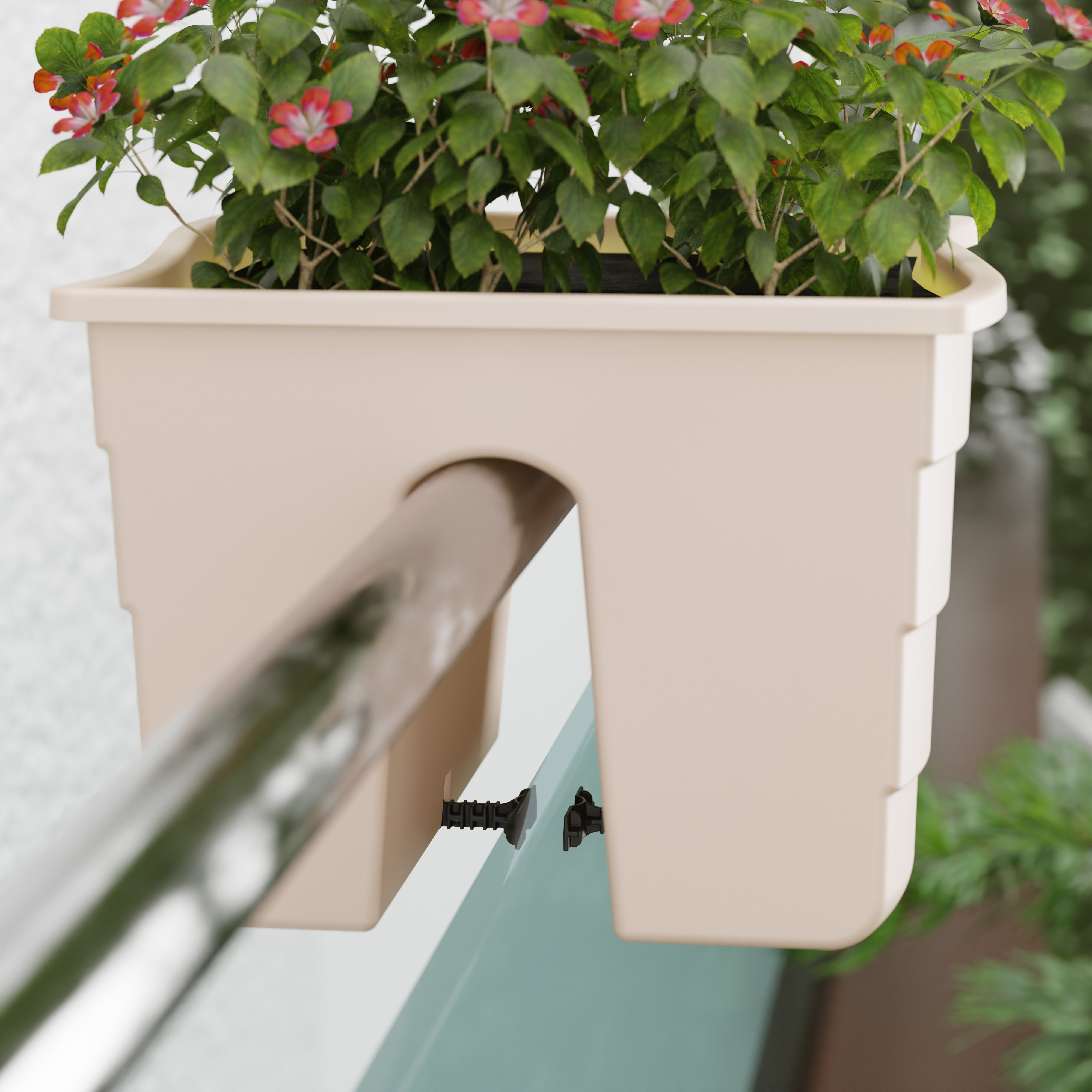 Кашпо легко установить на перила лестниц, ограждения открытых балконов, декоративные стенки. Специальные зажимы позволяют закрепить кашпо на разной ширине перила. Максимальная ширина рейлинга - до 5 см. Дно оснащено столбиками с отверстиями для отвода лишней воды во время дождя или при чрезмерном поливе.