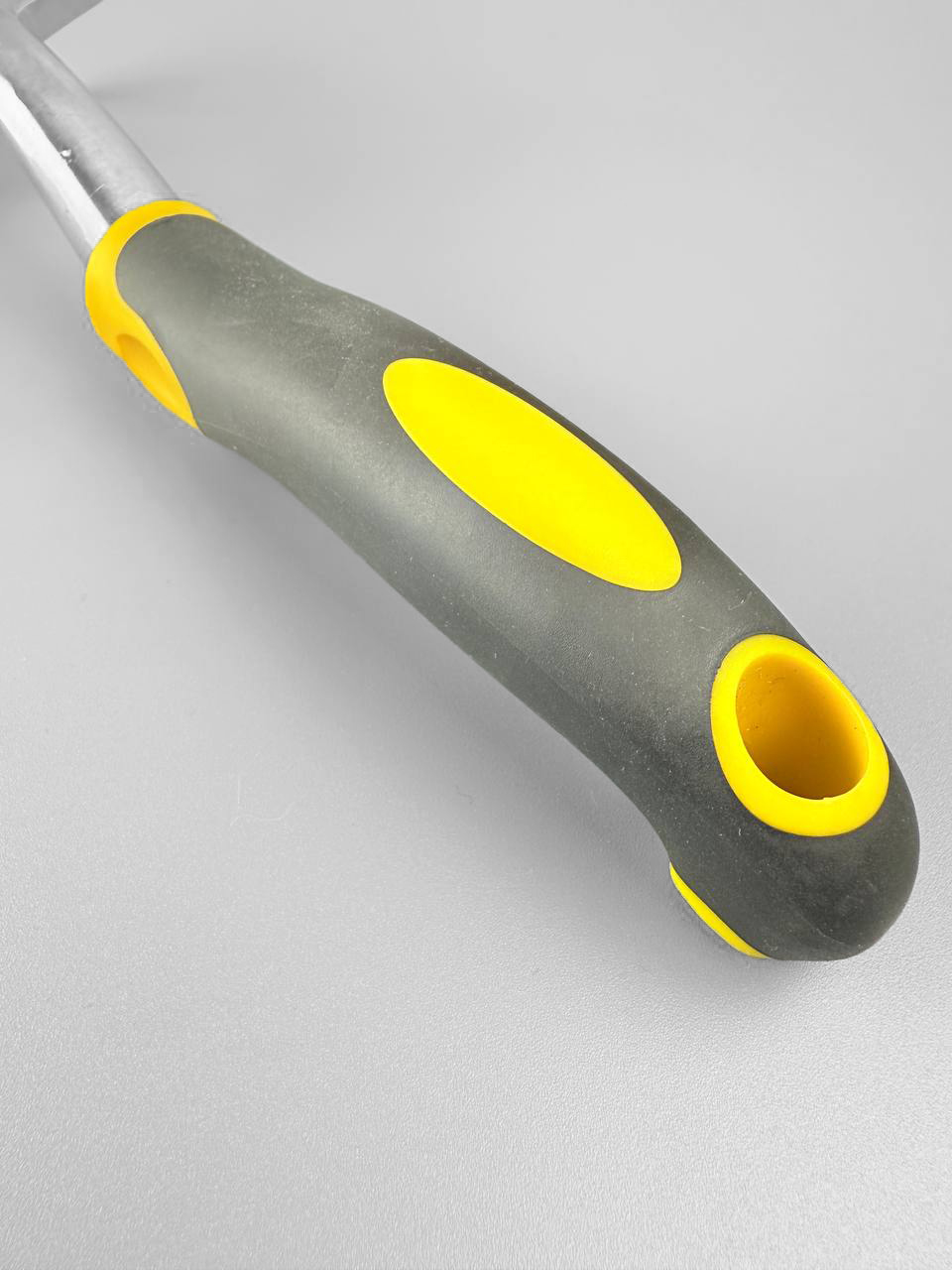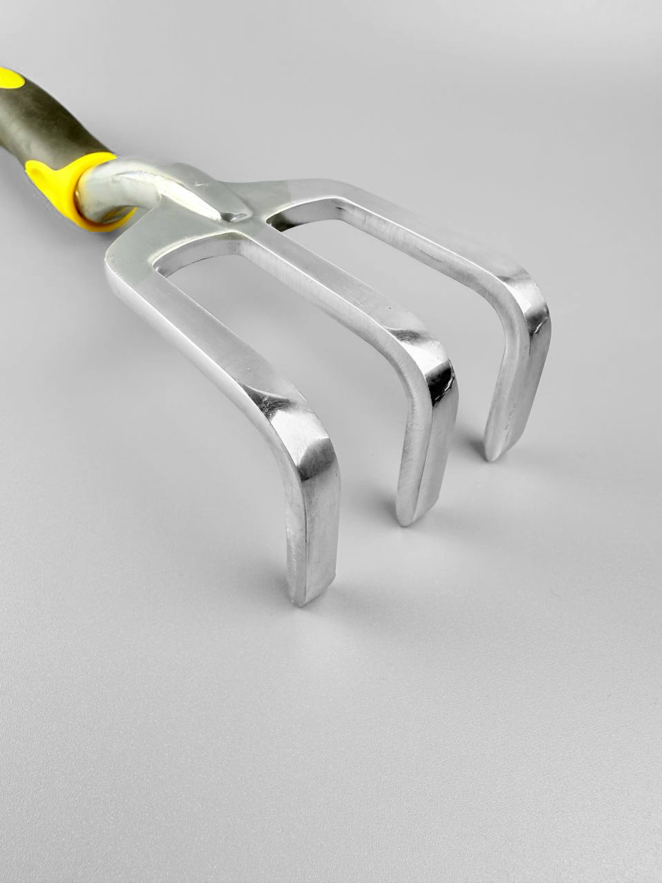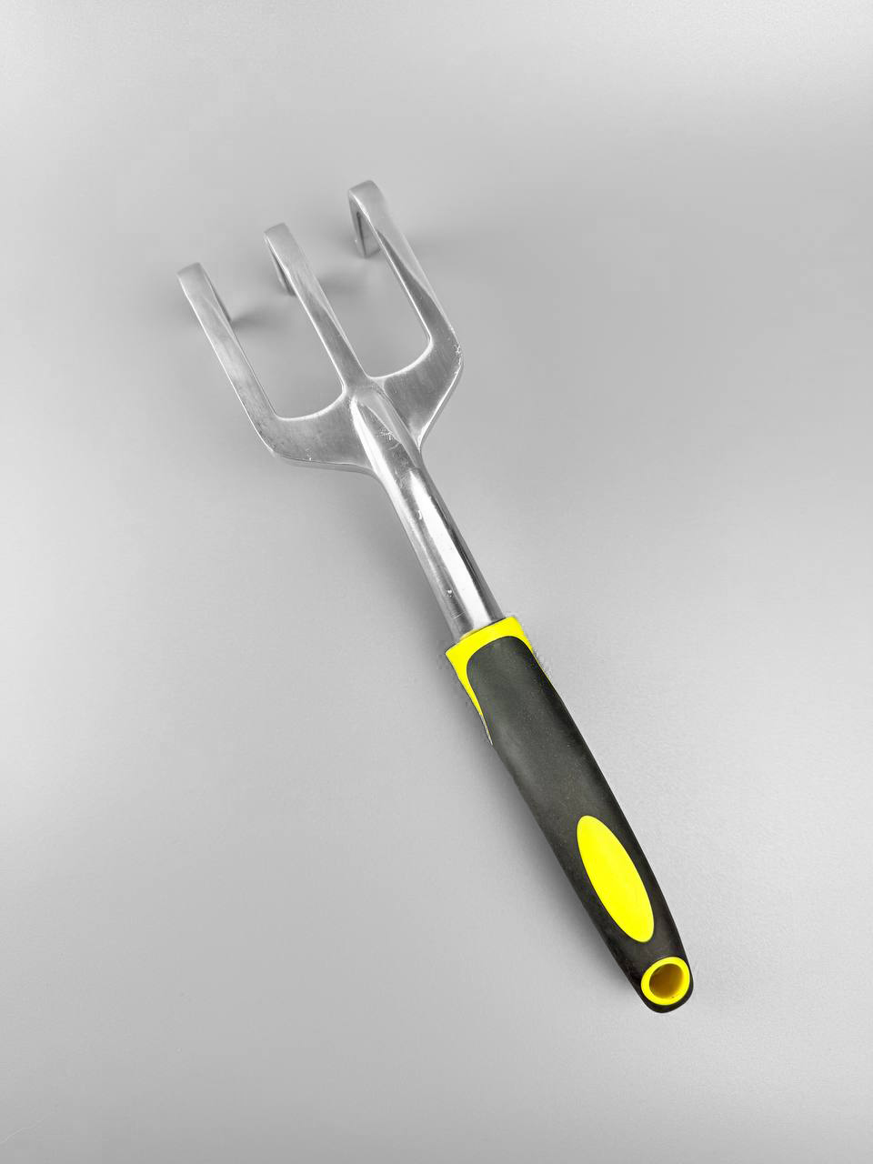 Инструмент изготовлен из прочного алюминиевого сплав. Цельнометаллическая конструкция инструмента устойчива к деформации даже при работе с плотными почвами. Эргономичная резиновая ручка делает работу более комфортной и удобной.