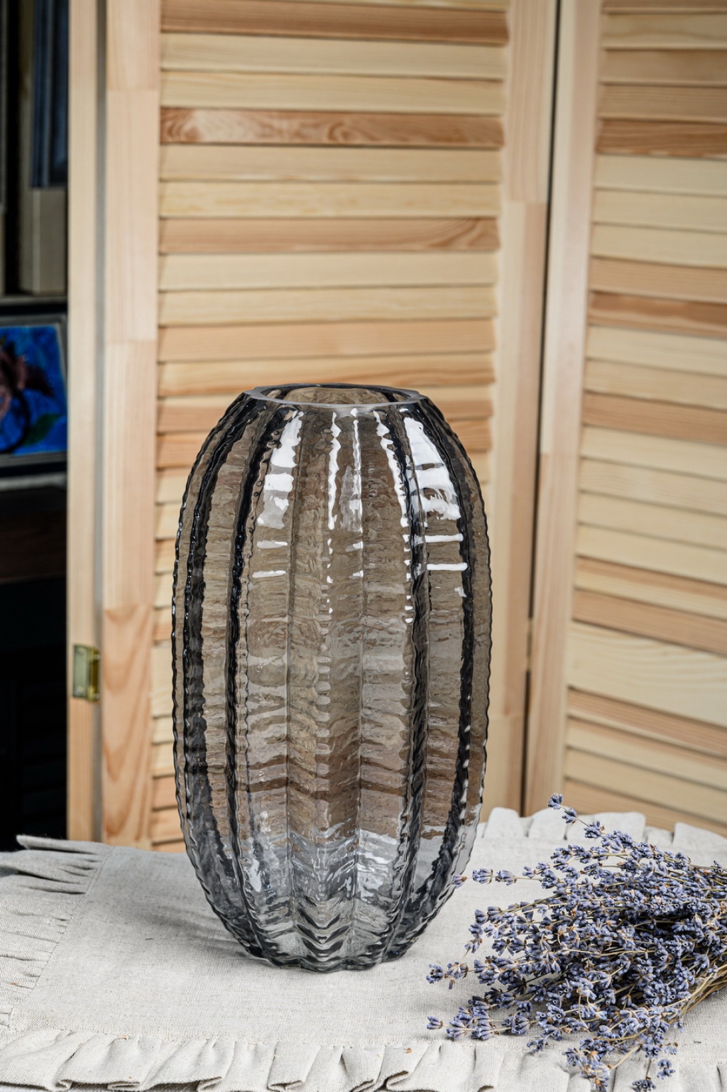 Стеклянная ваза из прозрачного затемненного стекла станет завершающим элементом оформления интерьера. Ваза с широким горлышком и устойчивым основанием имеет лаконичный дизайн с плавными геометрическими гранями, выполнена из качественного высокопрочного стекла. Дополнит красоту цветочного букета, составляя с ним единную декоративную композицию. В зависимости от выбранных цветов будет меняться настроение всего помещения.