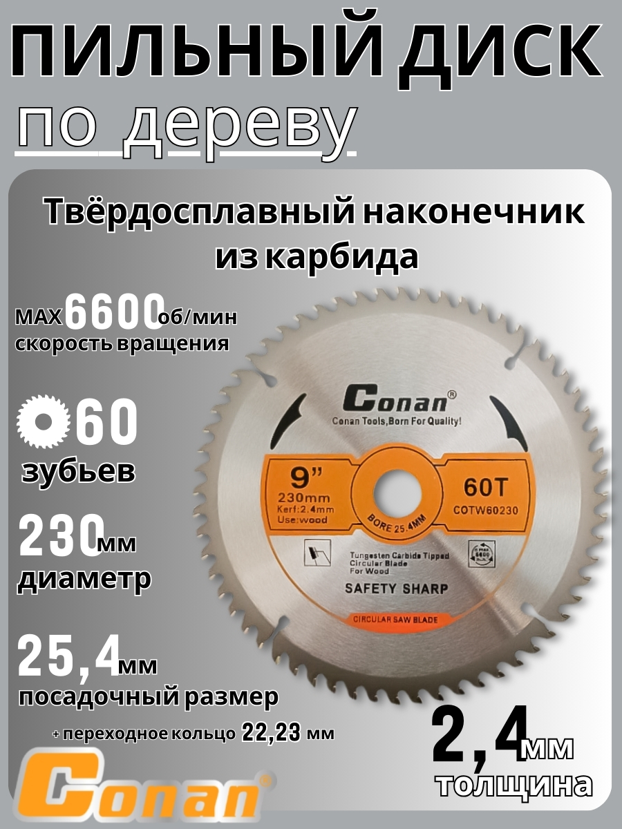 Диск для пилы Conan 9 дюймов, 230мм*22.23мм 60 зубьев COTW60230 OLS-778-115