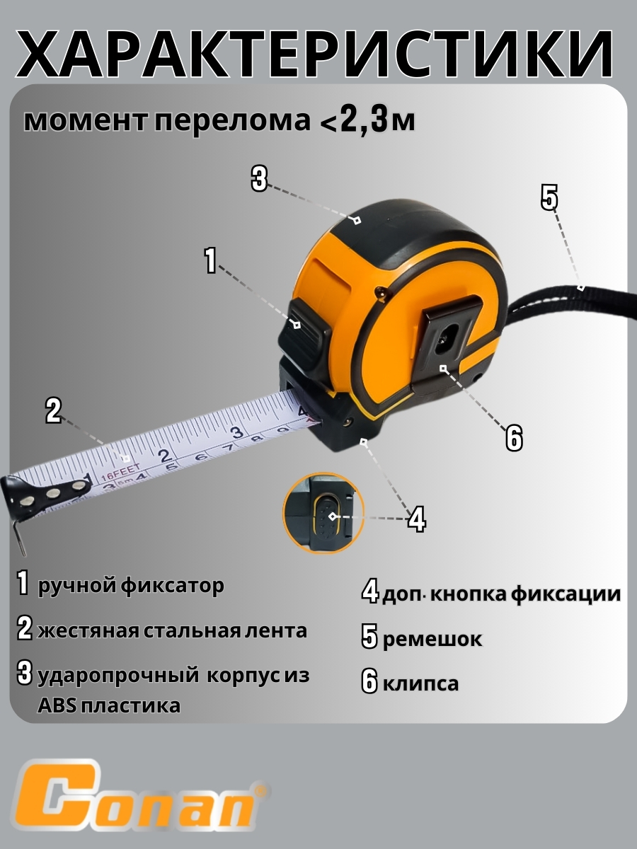 Зацеп свободного конца рулетки имеет люфт, что позволяет выполнять точные замеры как от предмета, так и с его захватом. Инструмент оснащен удобным механизмом фиксации полотна, который удерживает его в нужном положении.