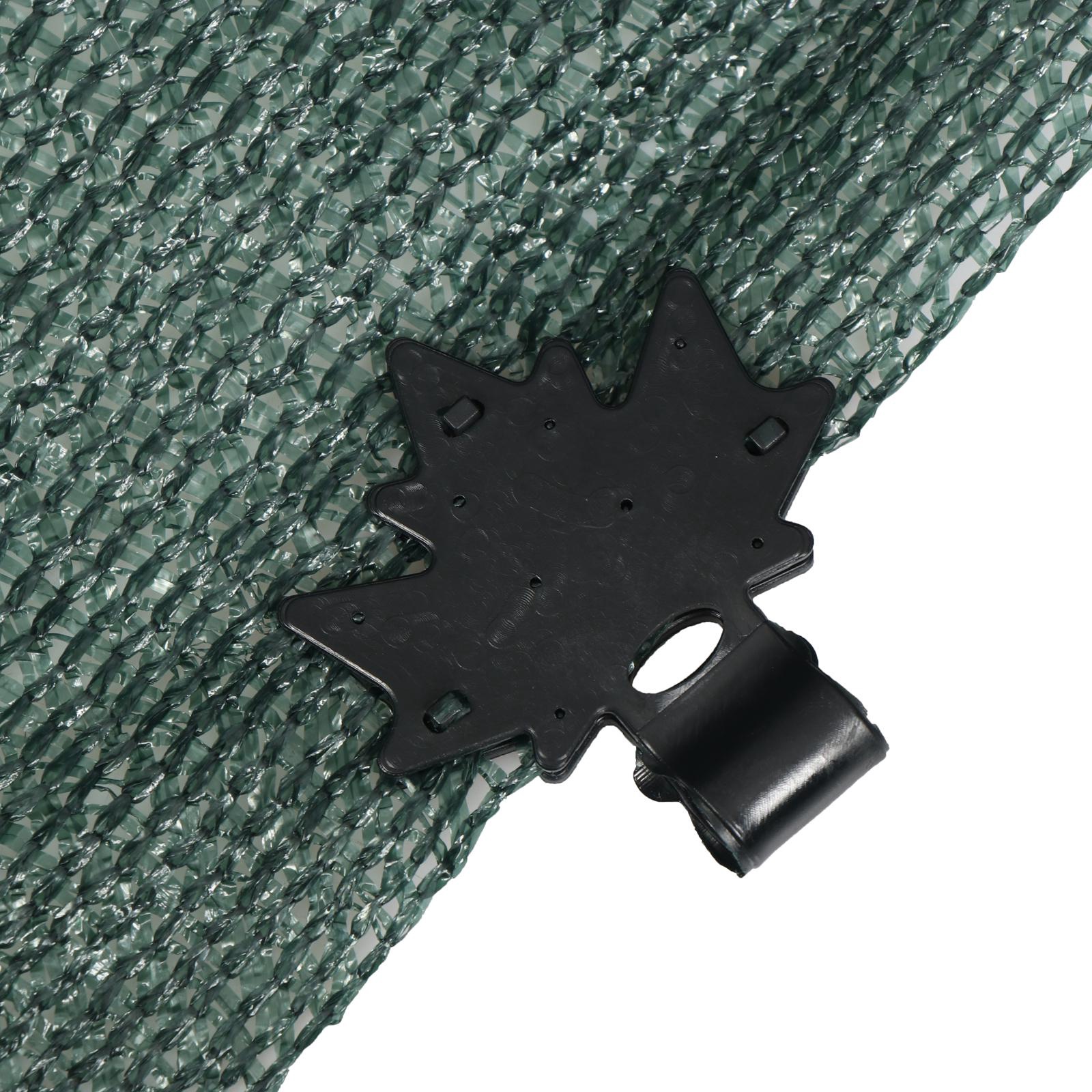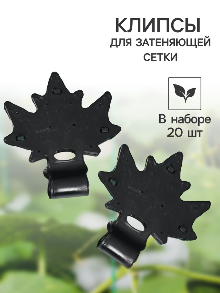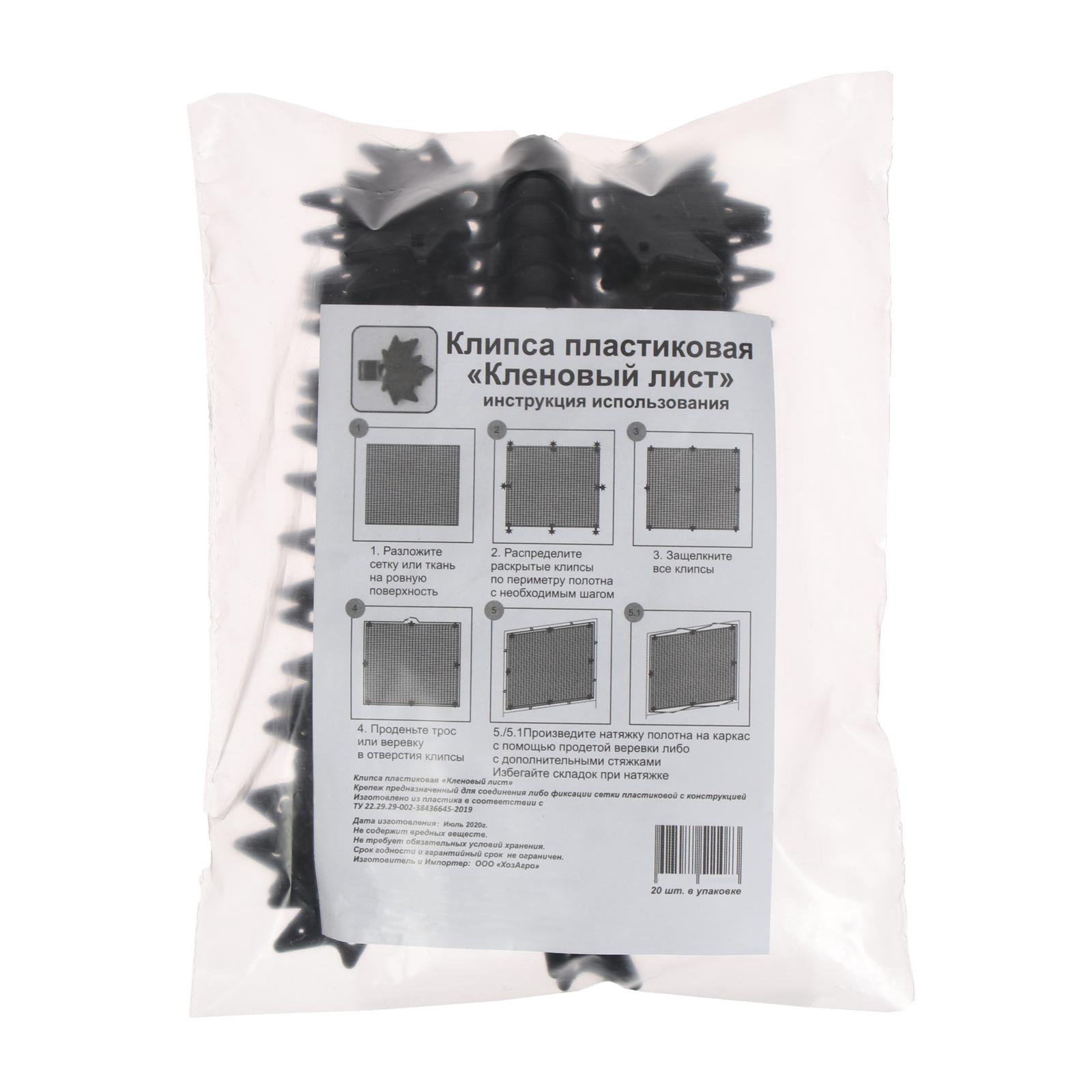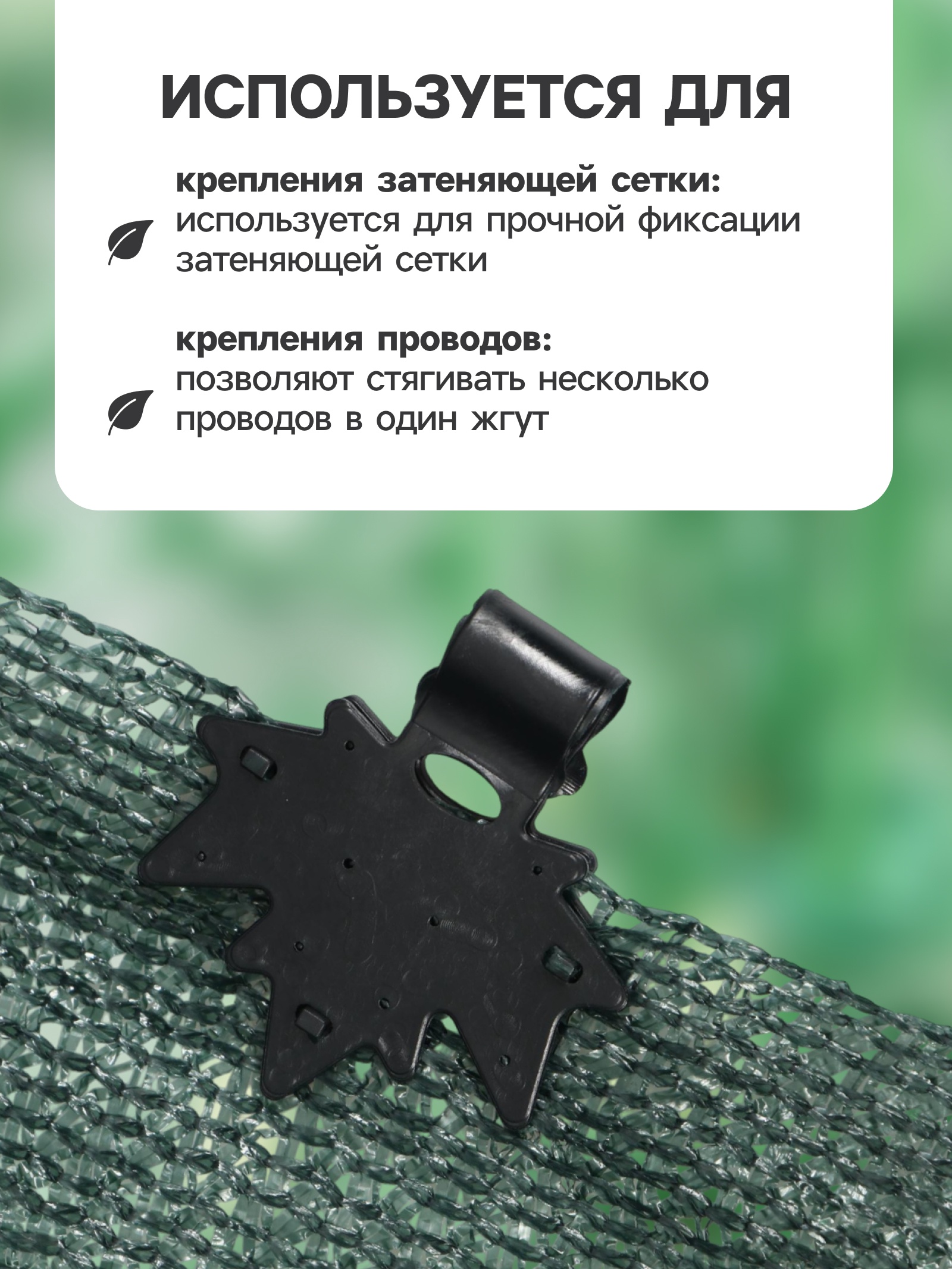 Клипса "Кленовый лист" изготовлена из устойчивого к солнцу и морозу пластика. "Кленовый лист" применяется для фиксации всех видов сеток: затеняющей, солнцезащитной, ограждающей, для защиты от птиц, маскировочной и других. плотностью 40 - 55%. Клипсы позволяют произвести тугую натяжку полотна с помощью веревки и обеспечивает надежную фиксацию при сильных порывах ветра. Благодаря использованию клипсы, сетка не рвется в местах креплений и прослужит дольше.