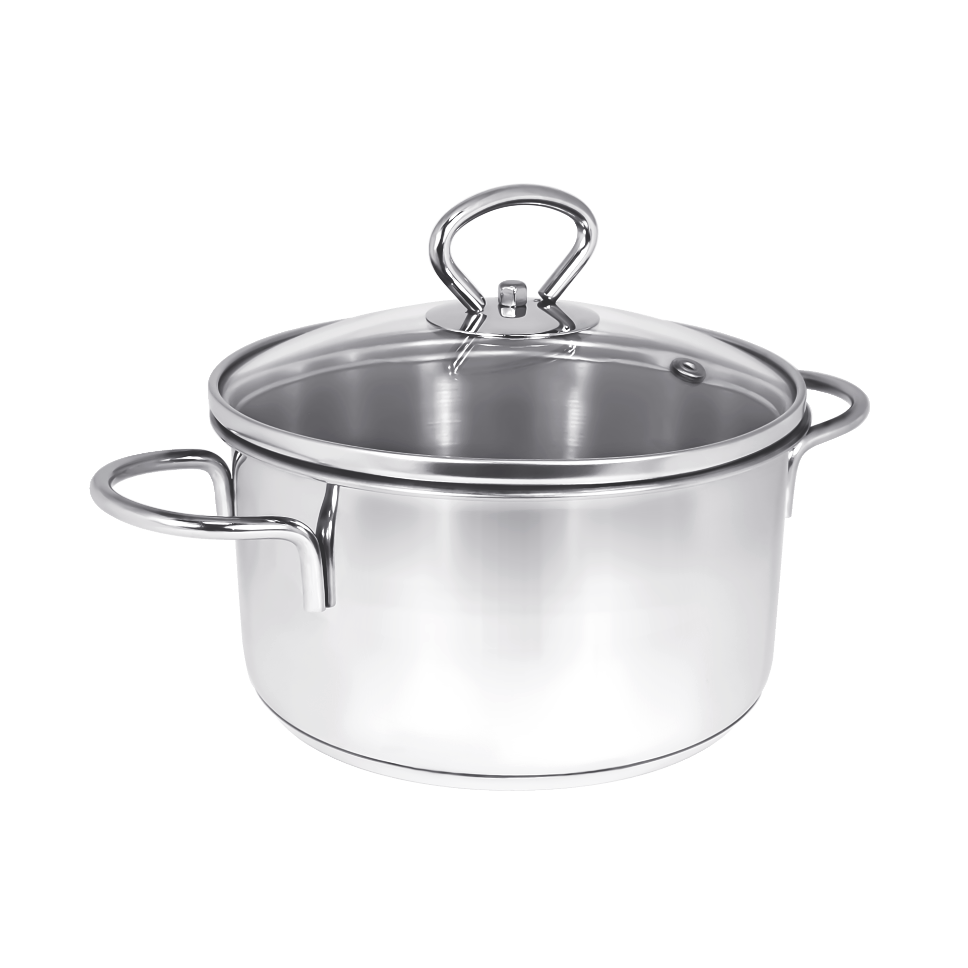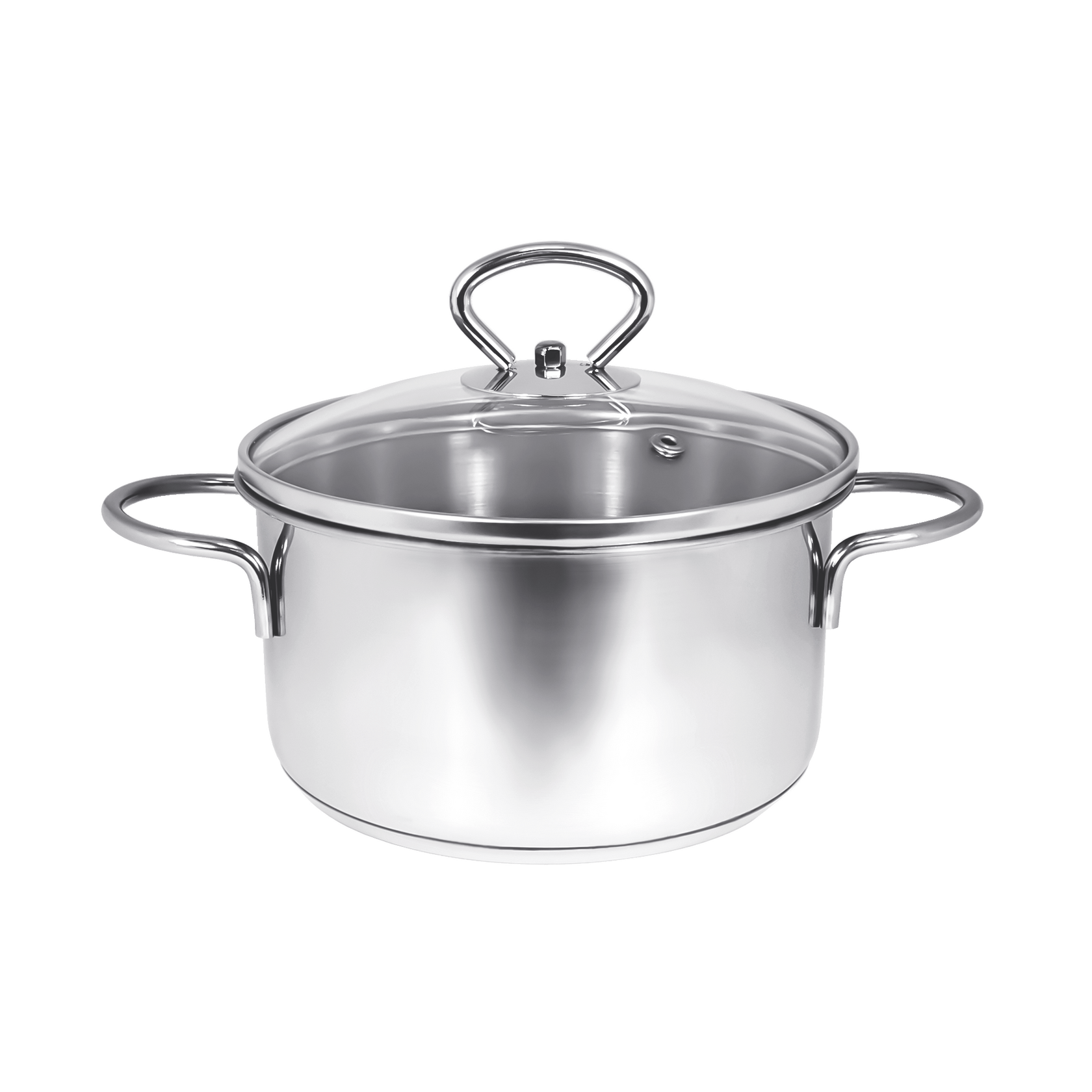 Кастрюля имеет цилиндрическую форму и две удобные ручки. Крышка из стекла с отверстием для выпуска пара позволяет наблюдать за процессом приготовления пищи и контролировать его.