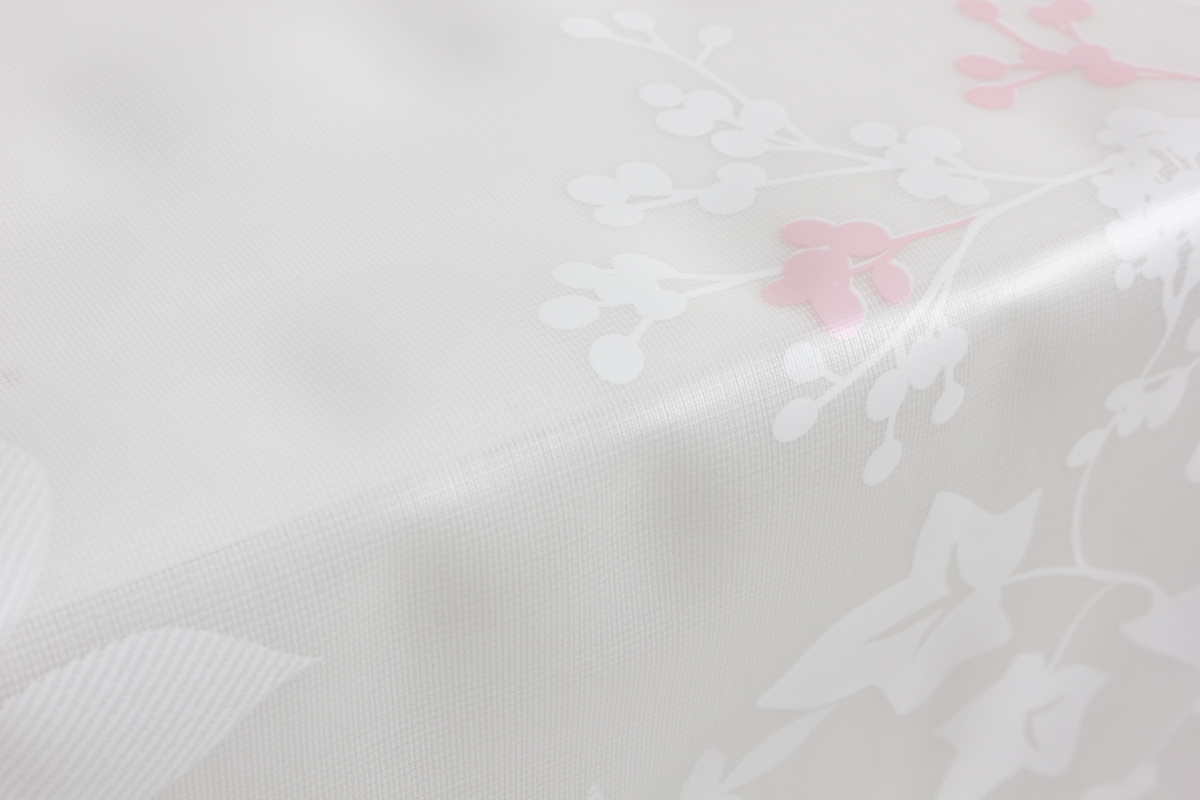 Клеенка из 100% двухслойного ПВХ без основы. 1-й слой с нанесенным печатным рисунком с эффектом переливания и бликов. 2-й слой сетчатая основа.