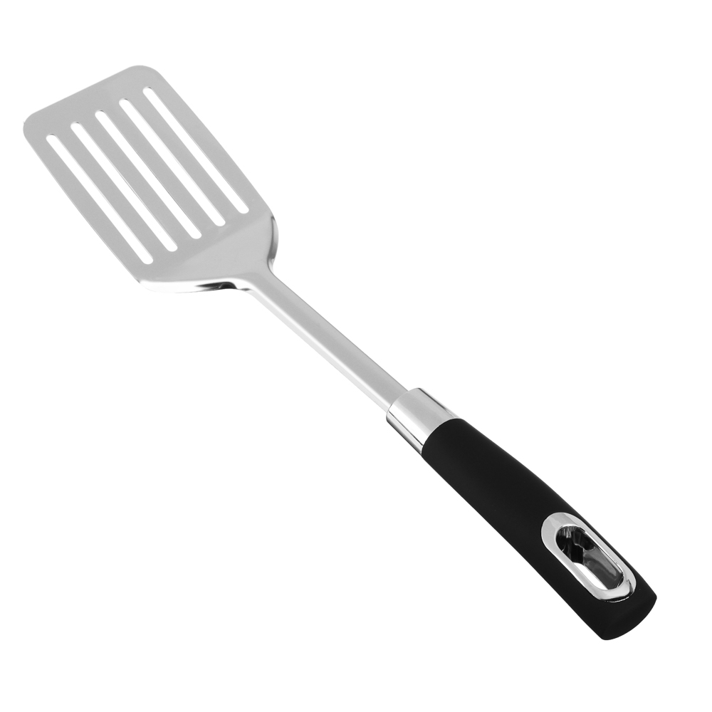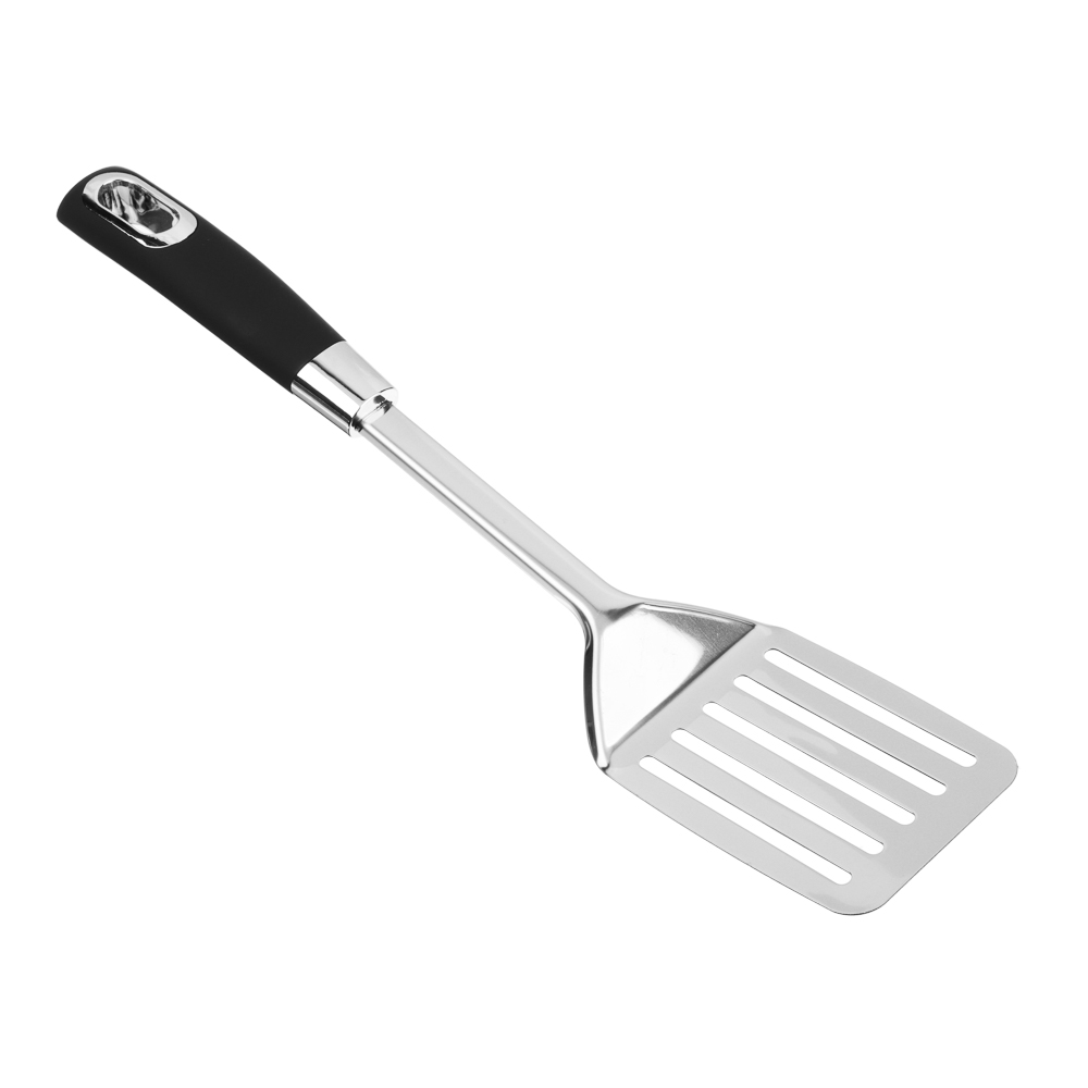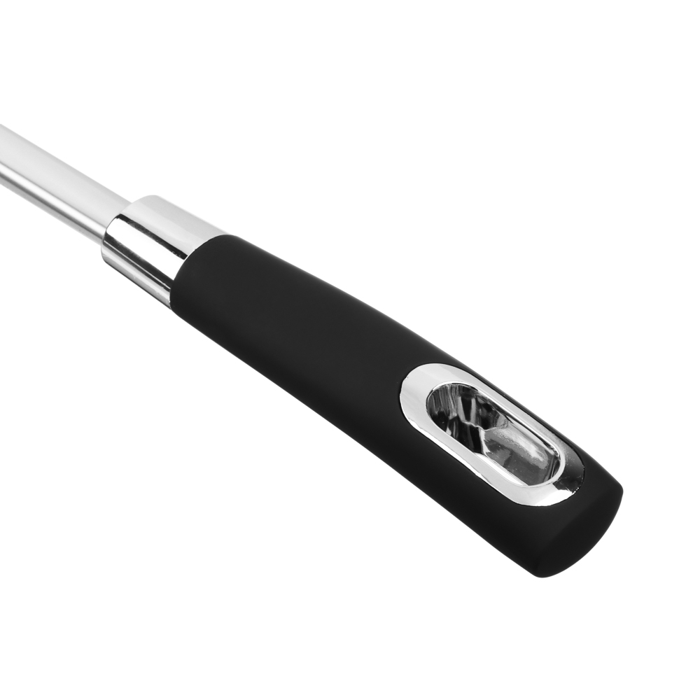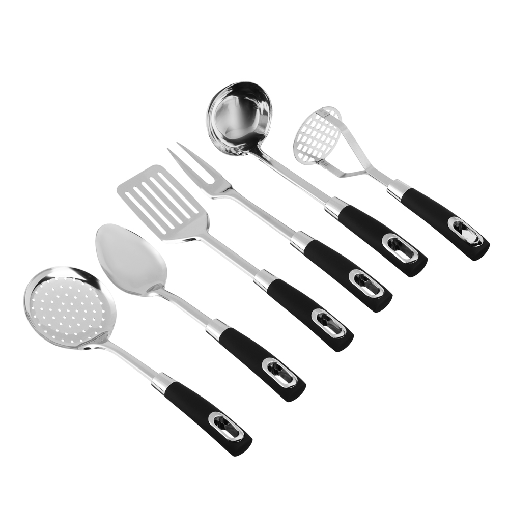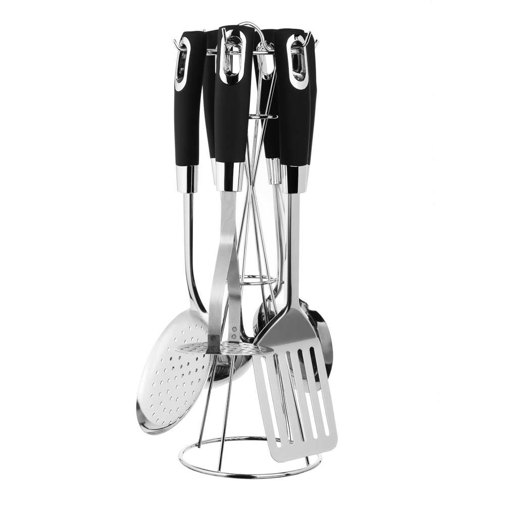 Набор кухонных принадлежностей из нержавеющей стали SATOSHI альфа включает 7 предметов, которые ежедневно необходимы каждой хозяйке: половник, сервировочную ложку, картофелемялку, шумовку, вилку транжирную для мяса и лопатку с отверстиями. Комплект также оснащен удобной устойчивой подставкой с крючками, которая позволяет хранить все приборы, занимая минимум пространства. Набор имеет современный дизайн и будет красиво смотреться на любой кухне.
