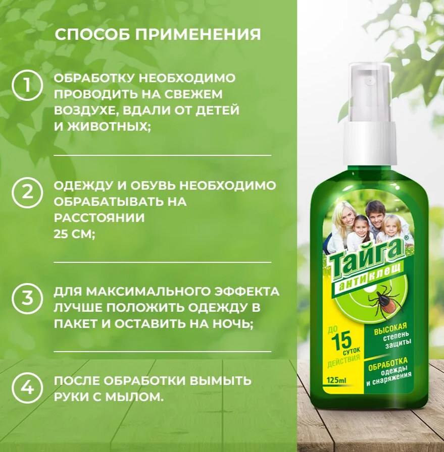 Назначение: универсальное средство от клещей и насекомых.Характеристика: средство предназначено для защиты людей от клещей, комаров и других кровососущих насекомых. Наносится исключительно на одежду и снаряжение. Подходит для обработки палаток, противомоскитных сеток, занавесок. Обладает высокой степенью защиты в течение 15 суток.