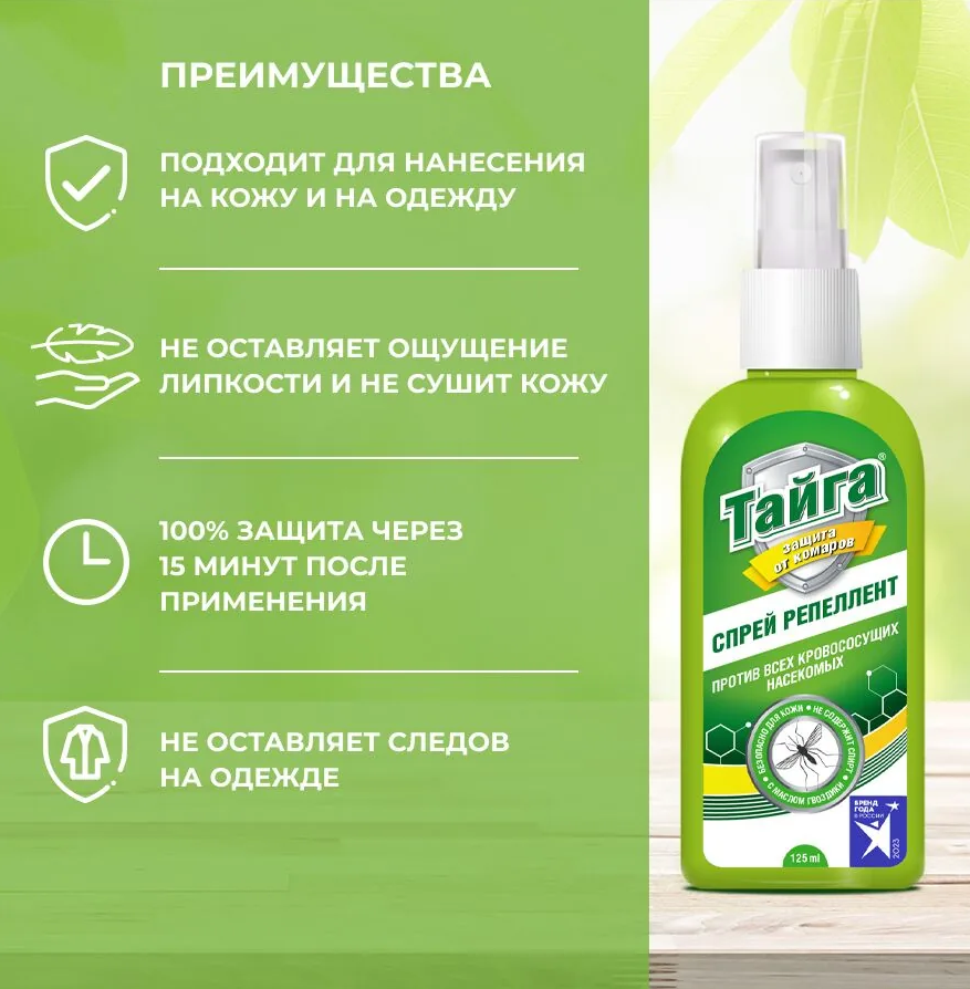 Репеллентный спрей торговой марки «Тайга» оптимально подходит для защиты от комаров, москитов и других кровососущих насекомых. Его можно использовать всей семье на прогулке, во время пикника на природе или работы на даче. Содержащее эфирное масло гвоздики средство наносится на открытые части тела, обеспечивая надежную защиту на протяжении трех часов. Благодаря распылителю удобно обрабатывать сразу большие участки кожи. Состав: Вода, ДВ-диметилфталат (35%), эфирное масло гвоздики, эмульгатор.
