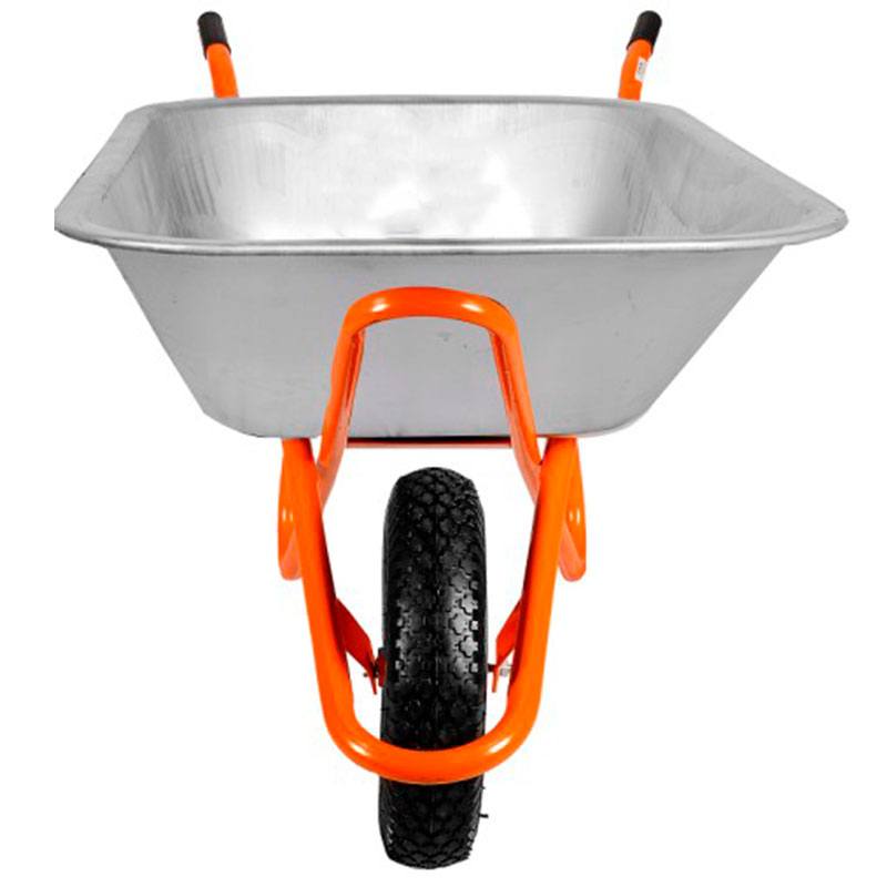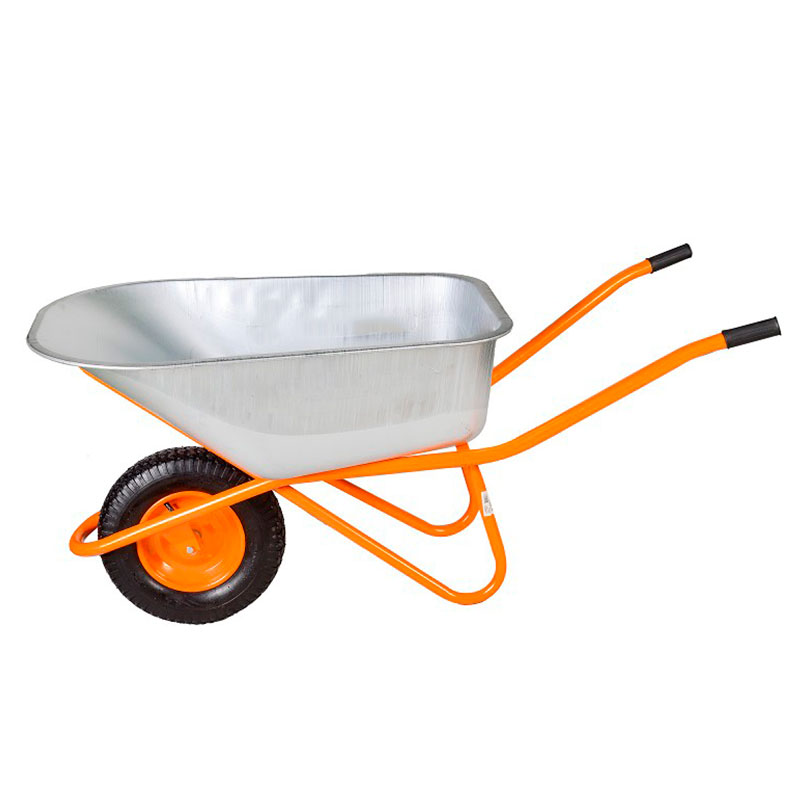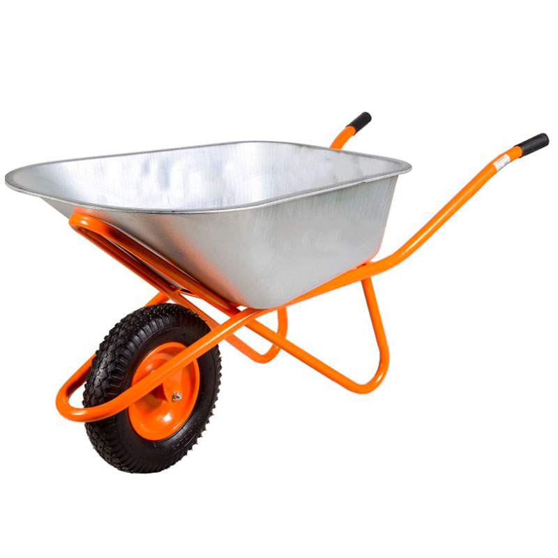 Тачка садово-строительная одноколесная предназначена для перевозки строительных материалов, а так же различных грузов при проведении сельскохозяйственных работ. Грузоподъемность 200 кг, объем кузова 110 л. Усиленная рама с подпятником выполнена из трубы Ø32 мм, толщина стенки 1,5 мм, окрашена порошковой эмалью. Дуга защиты колеса не только обеспечивает безопасность работы, но и удобство при разгрузке. Упор обеспечивает удобство при разгрузке. Кузов изготовлен из оцинкованной стали, толщина 0,9 мм. Опора кузова и сварные кронштейны колеса обеспечивают большую грузоподъемность. Тачка комплектуется пневматическим колесом с камерой. Наличие двух шариковых подшипников в колесе обуславливает более легкое перемещение тачки с грузом. Диск колеса сварной.