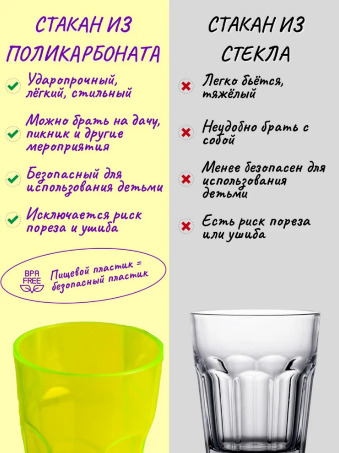 Это БЕЗОПАСНЫЙ вариант замены стеклянной посуды для организации питания в общественных местах: кафе, ресторанах, барах, гостиницах, спортивных клубах, бассейнах, SPA, школах, армейских столовых и т.д. Из-за своего легкого веса и удивительной прочности стаканы незаменимы для организации выездных банкетов, в походах (даже в условиях крайнего севера) и на отдыхе не природе. Благодаря поликарбонату посуда получается легкой и удивительно прочной — в десятки раз прочнее стеклянной. Стакан от компании ГАММА-ПЛАСТ нельзя разбить. Вы можете не просто уронить стакан из поликарбоната «Carbomix FC» на кафельный пол, но и ударить по нему молотком — он не разобьется. Стаканы приятны на взгляд и на ощупь, легко моются как руками, так и во всех типах посудомоечных машин. Пластик стабилен при температурах от -60°С до +130°С, он не впитывает запахи, устойчив к воздействию бытовых и профессиональных средств для мытья посуды, обладает низким коэффициентом теплопроводности и высокой огнестойкостью.
