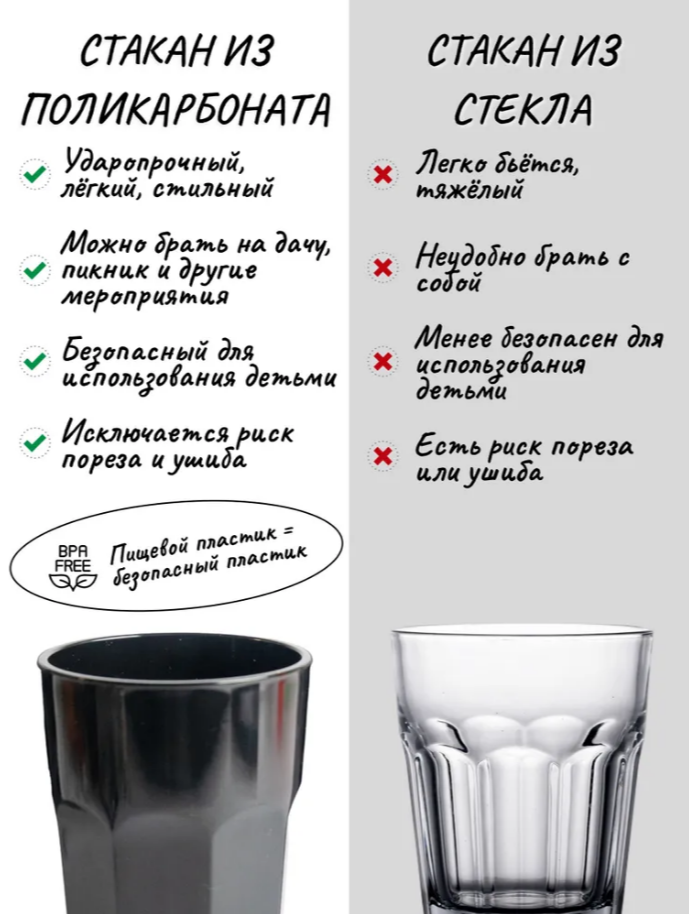 Это БЕЗОПАСНЫЙ вариант замены стеклянной посуды для организации питания в общественных местах: кафе, ресторанах, барах, гостиницах, спортивных клубах, бассейнах, SPA, школах, армейских столовых и т.д. Из-за своего легкого веса и удивительной прочности стаканы незаменимы для организации выездных банкетов, в походах (даже в условиях крайнего севера) и на отдыхе не природе. Благодаря поликарбонату посуда получается легкой и удивительно прочной — в десятки раз прочнее стеклянной. Стакан от компании ГАММА-ПЛАСТ нельзя разбить. Вы можете не просто уронить стакан из поликарбоната «Carbomix FC» на кафельный пол, но и ударить по нему молотком — он не разобьется. Стаканы приятны на взгляд и на ощупь, легко моются как руками, так и во всех типах посудомоечных машин. Пластик стабилен при температурах от -60°С до +130°С, он не впитывает запахи, устойчив к воздействию бытовых и профессиональных средств для мытья посуды, обладает низким коэффициентом теплопроводности и высокой огнестойкостью.