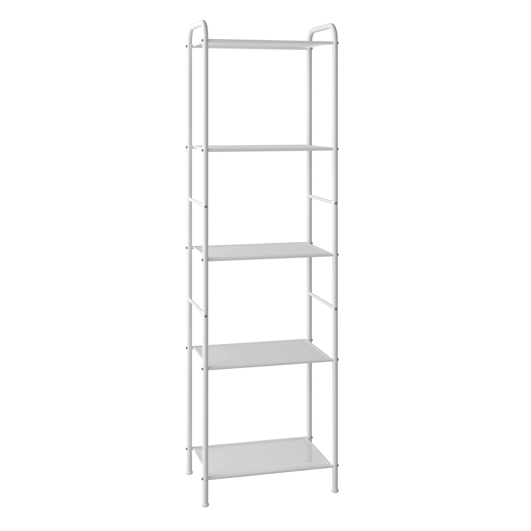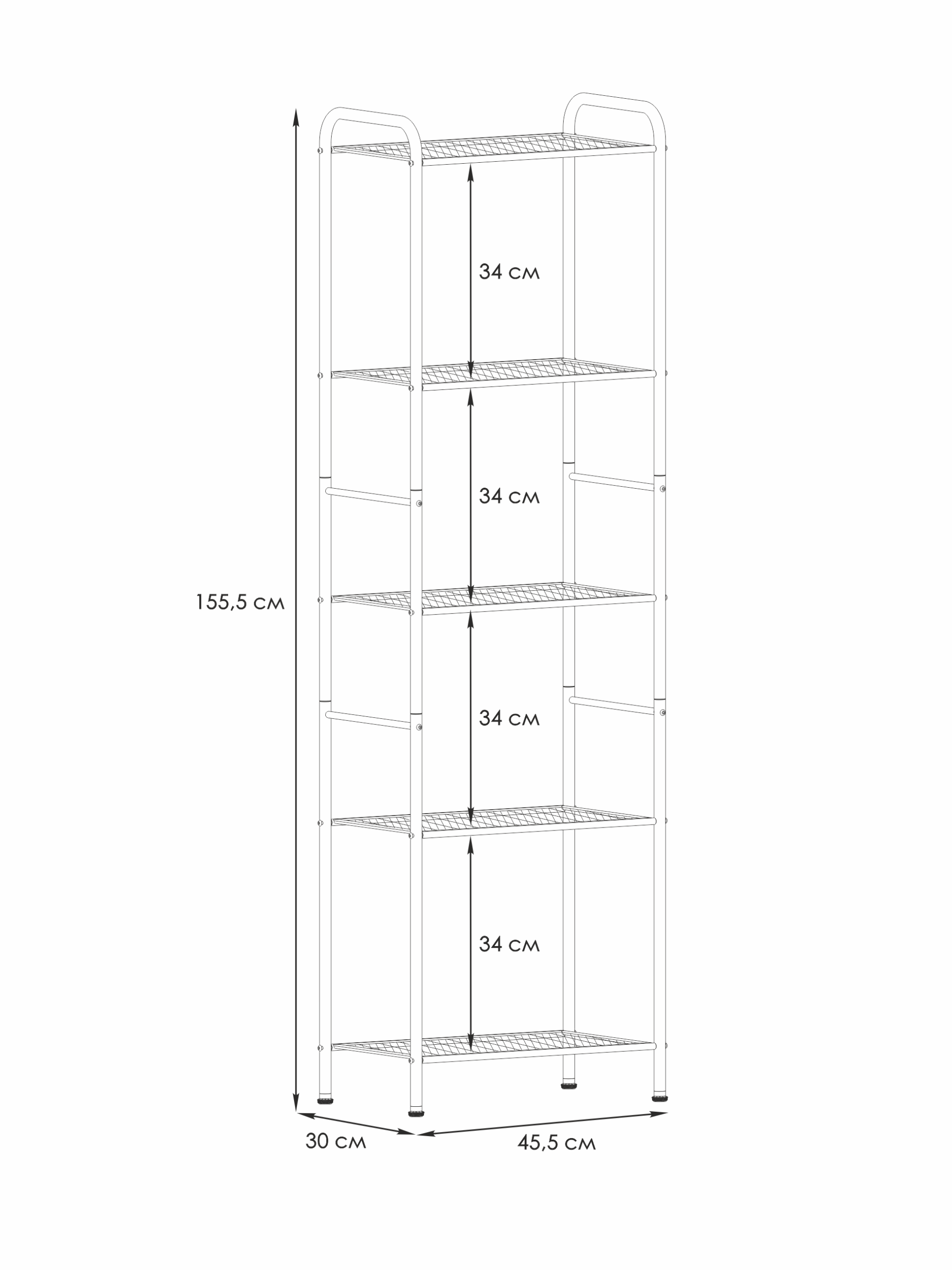 Напольный стеллаж - это стиль и качество по доступной цене и средство для организации хранения в вашей квартире! Простой в сборке аксессуар украсит любое помещение. Изделие изготовлено из высокопрочного металлического материала с полимерный покрытием. Оно имеет прочный каркас и прослужит долгое время. Конструкция оснащена 5 полками для вашего комфорта и удобства. Они фиксируются вертикальными перекладинами на углах. Открытый комнатный стеллаж на регулируемых ножках имеет надежные крепления. Сетчатые полочки выдержат нагрузку до 8 кг. Эта модель хороша не только для домашнего пользования всей семьи. Благодаря минималистичному красивому дизайну разборная этажерка добавит уют в любое офисное помещение или дачный дом. Бытовой интерьерный стеллаж станет декором в балконном или комнатном пространстве. Его можно использовать как книжный шкаф или хранить продукты. Система хранения имеет практичные высоту и ширину. На нем можно хранить книги одежду обувь украшения, аксессуары, сувениры, цветы и растения.