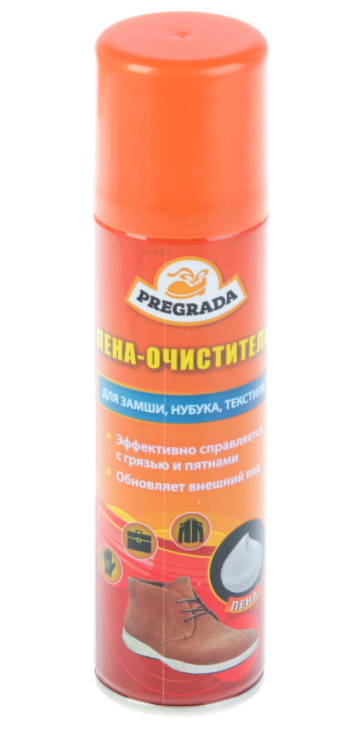 PREGRADA — ПЕНА-очиститель (с пенообразующим дозатором) для обуви из замши, нубука, ткани и гладкой кожи 150 мл. Предназначен для чистки обуви, перчаток, сумок, верхней одежды, мебели.