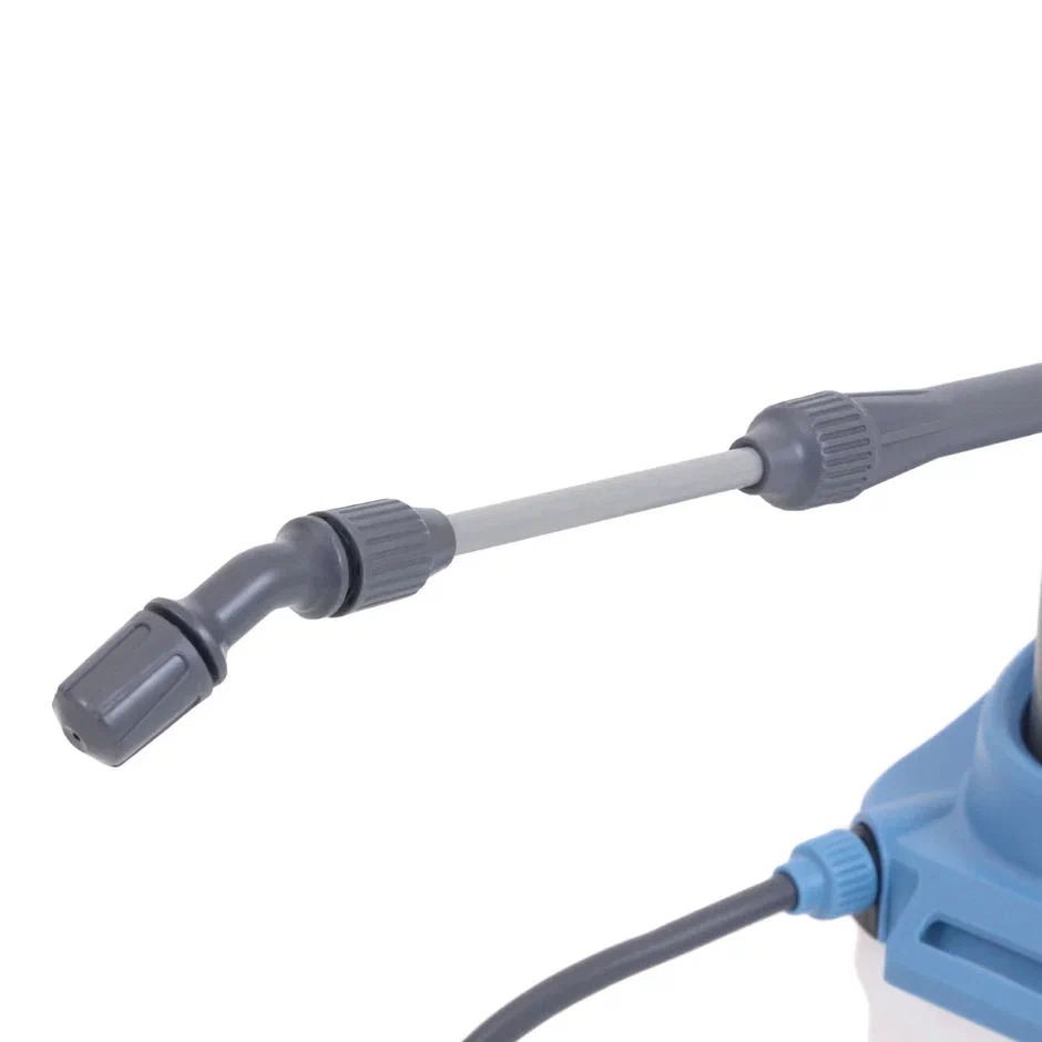 Опрыскиватель аккумуляторный с телескопической штангой, длина которой регулируется от 650 до 970 мм, позволяет производить обработку на различной высоте и легко дотянуться до верхушек деревьев. Благодаря фиксации кнопки включения можно опрыскивать, не удерживая ее, что удобно при длительной работе.
