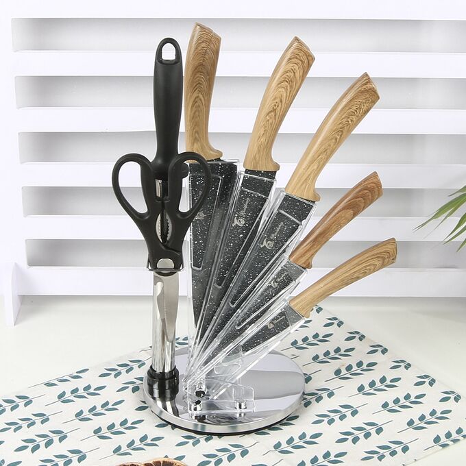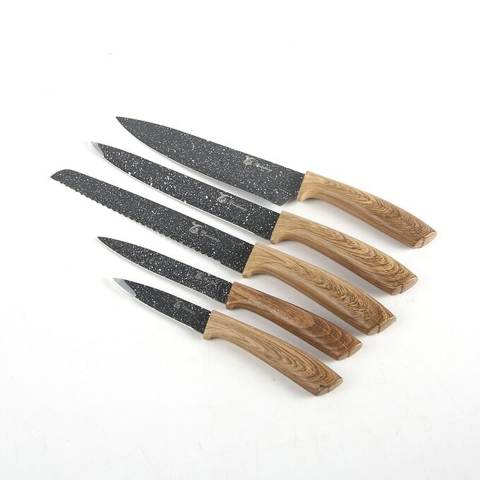 Кухонный набор ножей станет Вашим помощником по готовке. А благодаря его дизайну кухня заиграет по-новому. Каждый ножик острый и долго держит заточку. При необходимости Вы можете наточить его еще сильнее с помощью мусата/заточки. Комплект ножей изготовлен из нержавеющей коррозионностойкой стали.