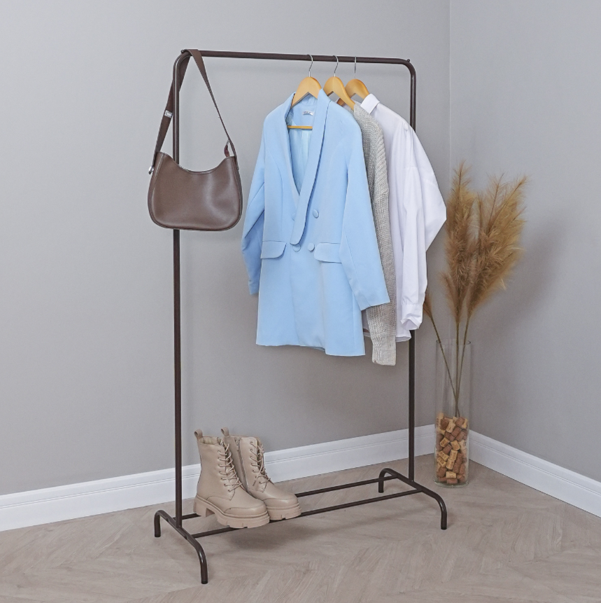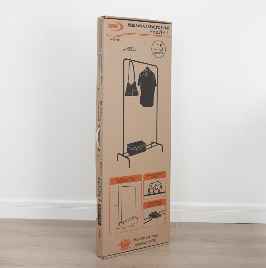 Эта напольная вешалка от российского производителя ЗМИ — стильное решение для хранения одежды. Она отличается лаконичным дизайном и доступна в нескольких цветах, что позволяет легко вписать её в любой интерьер: от спальни и гостиной до прихожей или офиса. Металлическая конструкция выдерживает до 20 кг на рейле и до 30 кг на полке. На перекладине можно разместить до 15 плечиков, которые не соскальзывают благодаря ограничителям. Сверху есть удобный крючок для зонтов и сумок. Вешалка поставляется в разобранном виде с инструкцией и всеми необходимыми инструментами для сборки.