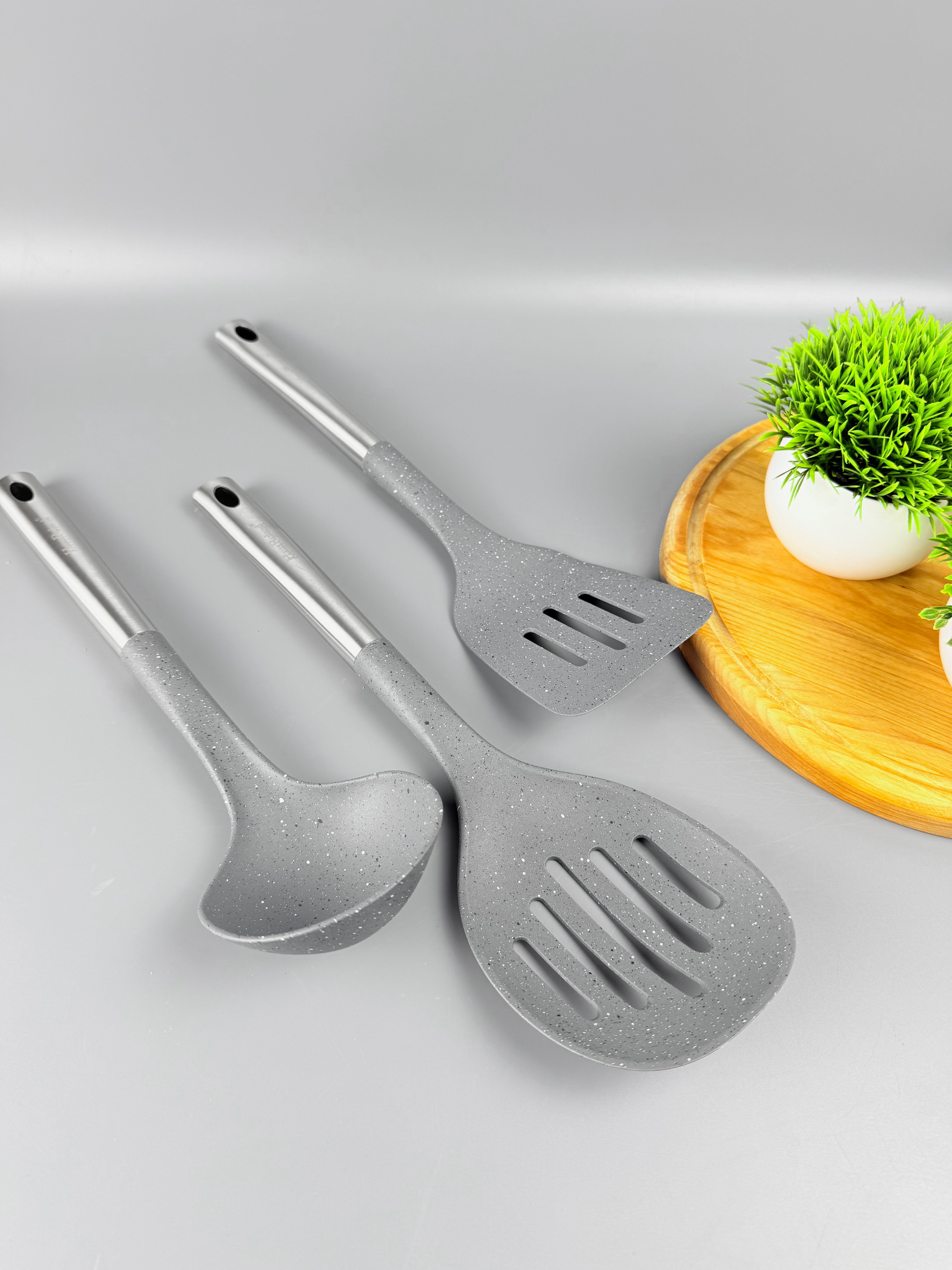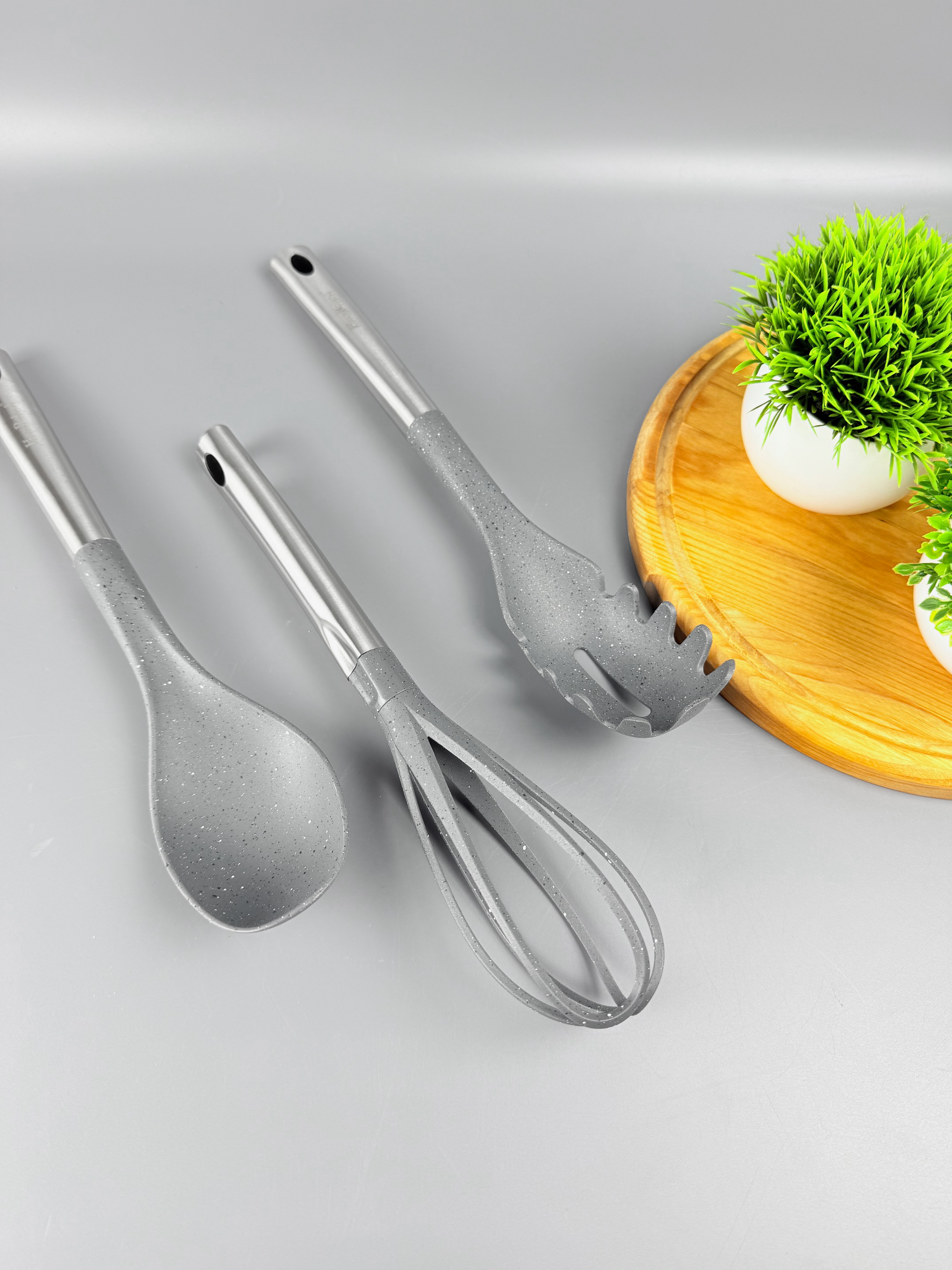 Набор кухонных принадлежностей на подставке выполнен из нержавеющей стали и нейлона. В составе набора: