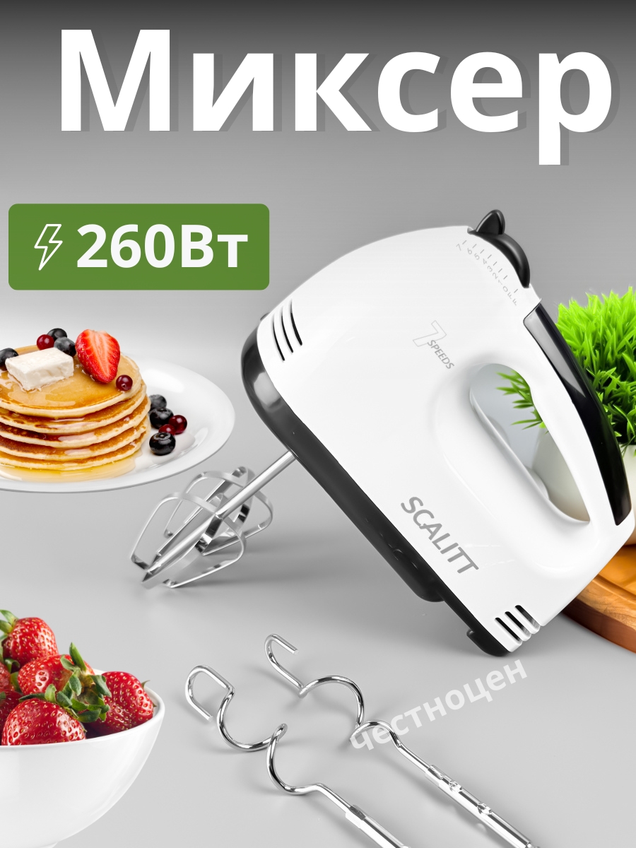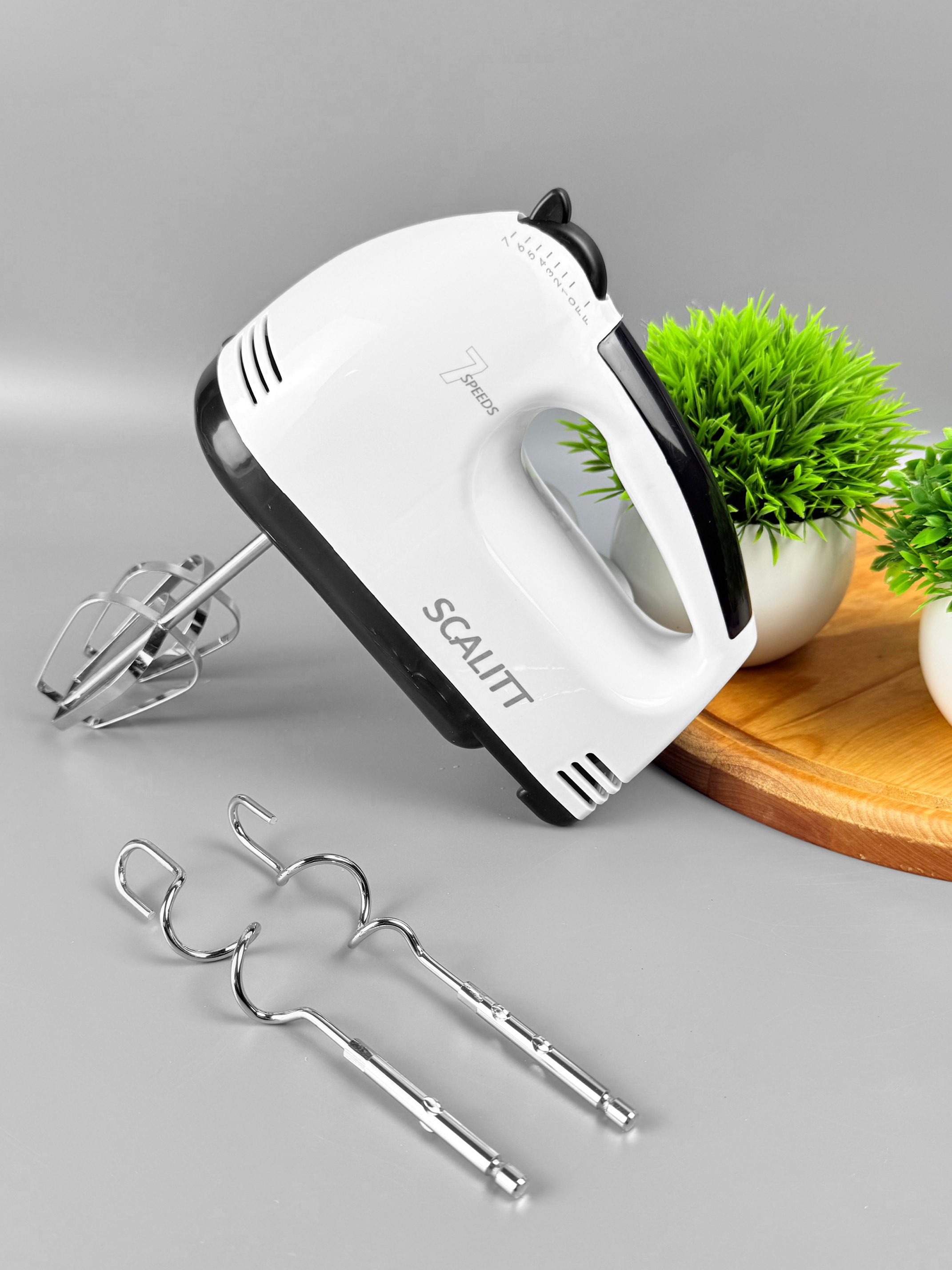 Вам нужно быстро приготовить крем или соус? С миксером вы сэкономите силы и время. Миксер работает в 7 скоростных режимах и вы без труда подберете оптимальный как для быстрого взбивания, так и для деликатного смешивания. Используйте входящие в комплект крюки для замешивания идеального жидкого или густого теста. Компактный и легкий прибор комфортно держать на весу даже длительное время.