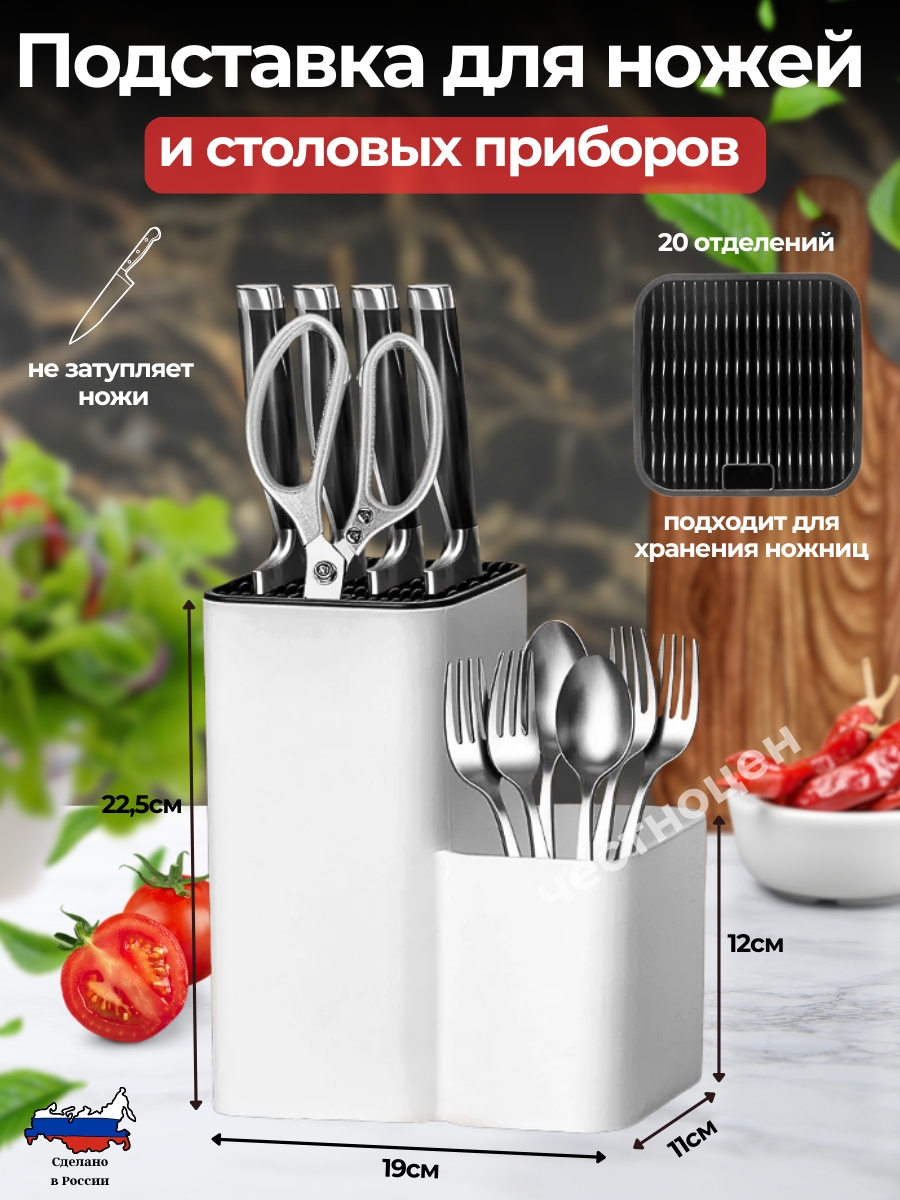 Подставка для ножей и столовых приборов — удобное решение для кухни. Простой дизайн вписывается в любой интерьер. Конструкция не затупляет лезвия ножей, отсек для ножниц и столовых приборов держит всё под рукой. Подставка проветривается, предотвращая скопление влаги. Закажите сейчас для порядка на кухне!