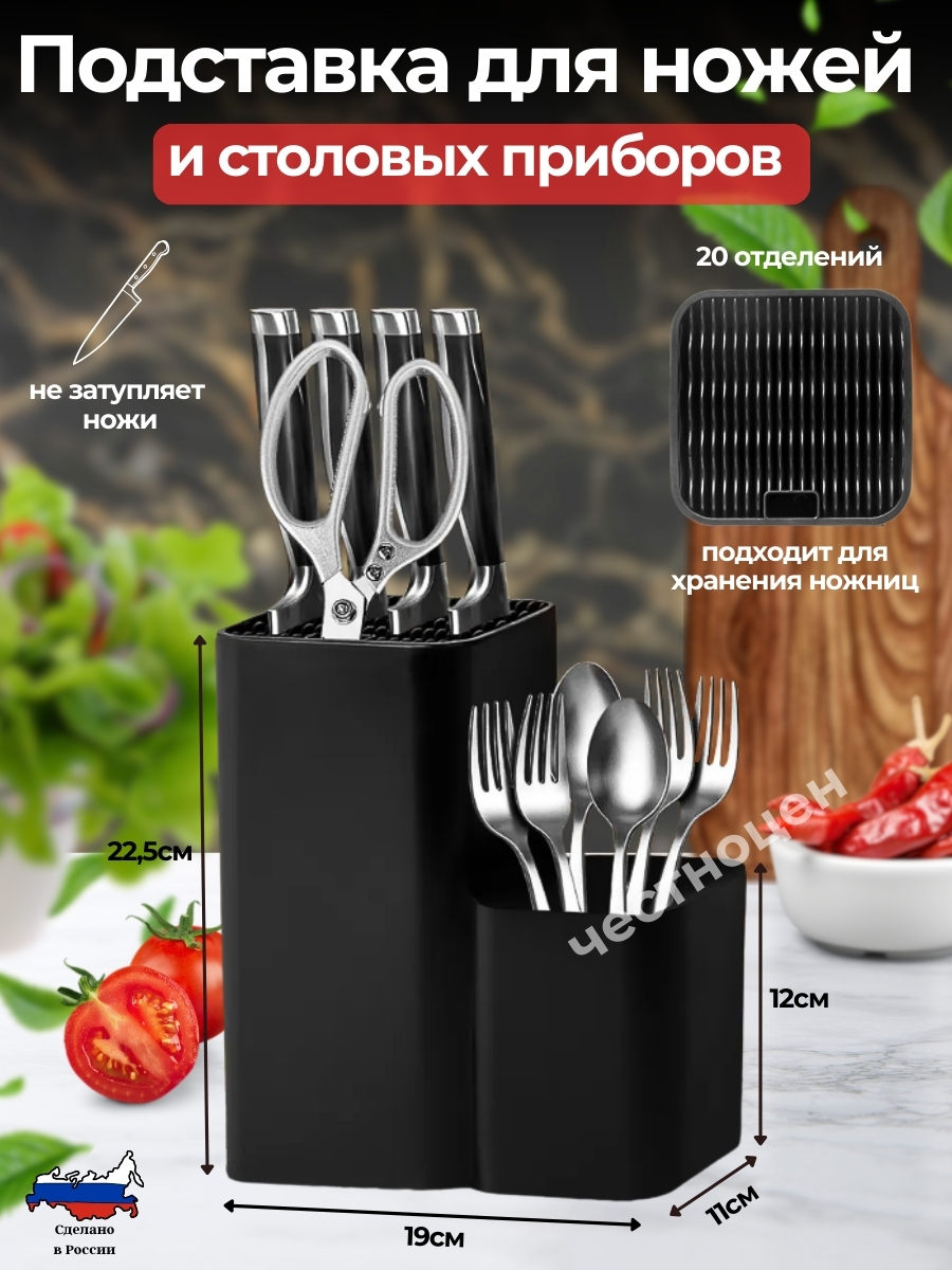 Подставка для ножей и столовых приборов — удобное решение для кухни. Простой дизайн вписывается в любой интерьер. Конструкция не затупляет лезвия ножей, отсек для ножниц и столовых приборов держит всё под рукой. Подставка проветривается, предотвращая скопление влаги. Закажите сейчас для порядка на кухне!