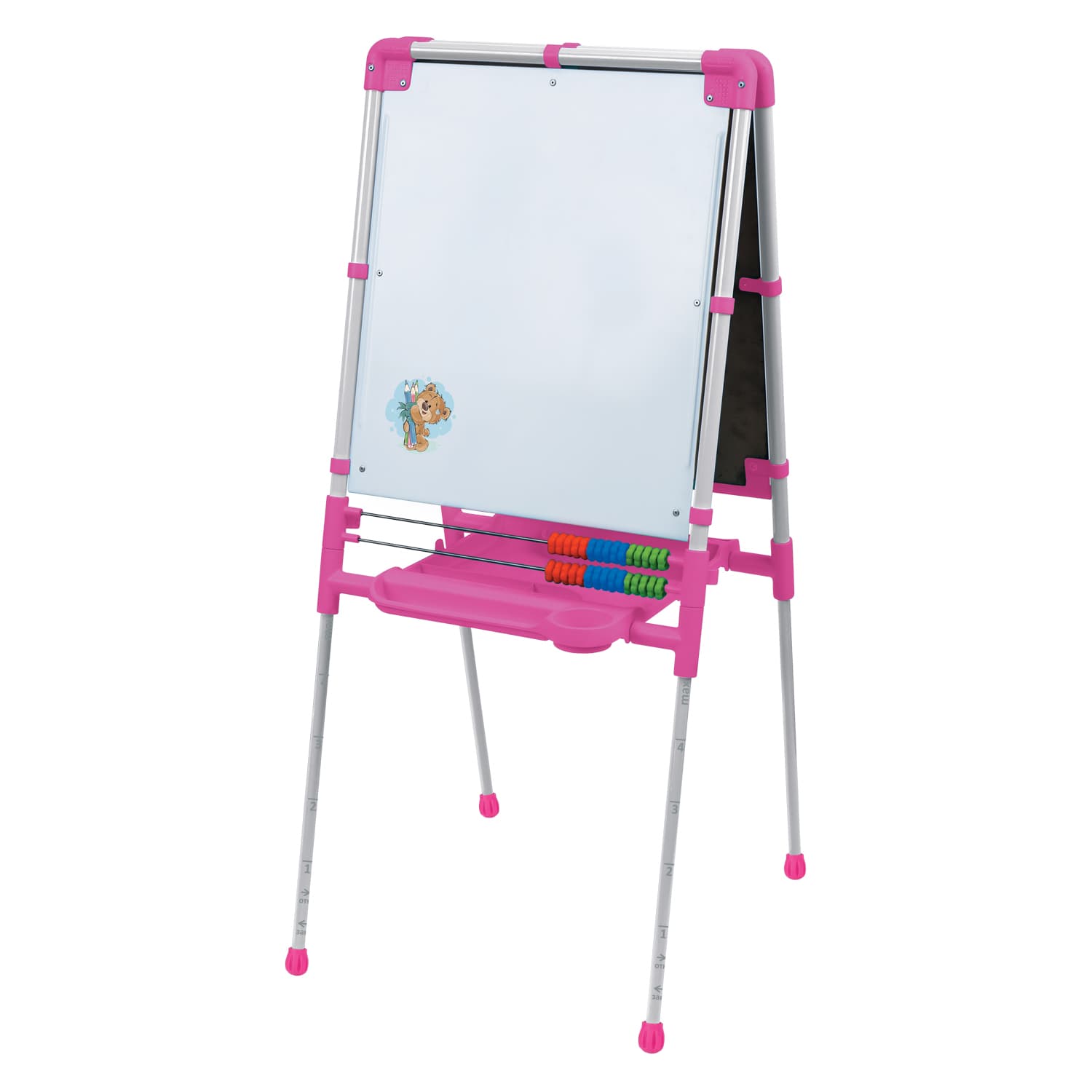 Мольберт с возможностью регулировки высоты для детей от 3 лет. Набор для творчества в комплекте.Две рабочие поверхности: меловая – для рисования мелом; магнитная – для рисования маркерами на водной основе и игр с магнитной азбукой и мозаикой