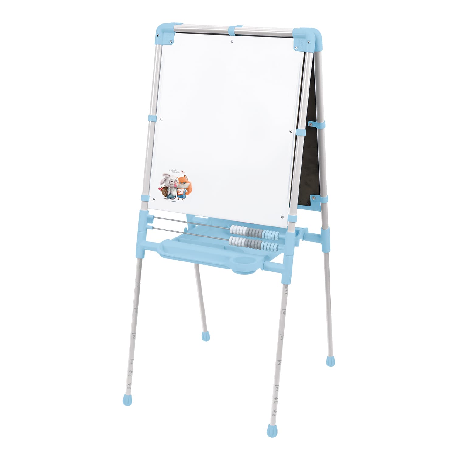 Мольберт с возможностью регулировки высоты для детей от 3 лет. Набор для творчества в комплекте.Две рабочие поверхности: меловая – для рисования мелом; магнитная – для рисования маркерами на водной основе и игр с магнитной азбукой и мозаикой