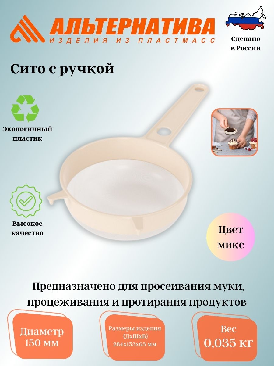 Сито предназначено для просеивания муки, процеживания или протирания продуктов питания для младенцев. Прочная сетка и корпус обеспечивают изделию износостойкость и долговечность. Такое сито привлечет внимание своей простотой и привлекательной ценой, а также станет достойным дополнением к кухонному инвентарю.