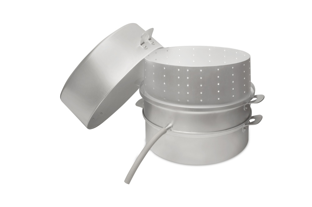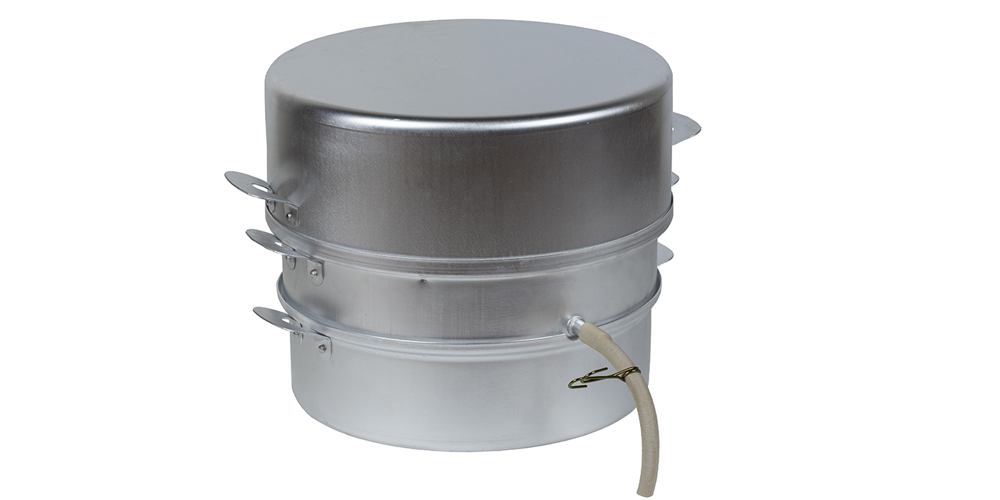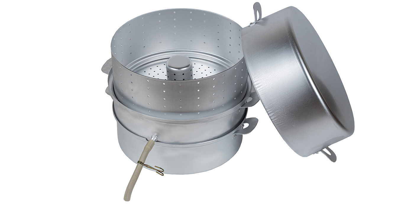 Посуда изготовлена из алюминия пищевого без покрытия. Соковарка очень легко разбирается, собирается и моется. Ее конструкция состоит из нескольких модулей: базовой кастрюли, емкости для сбора готового сока, сетки для загрузки свежих плодов и глубокой крышки.