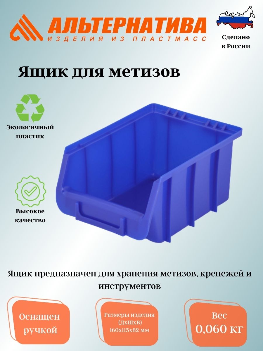 Ящик предназначен для хранения метизов, крепежей и инструментов. Ящик устроен так, что для того чтобы взять необходимый крепеж или инструмент, нет необходимости его выдвигать или переносить. Благодаря открытой конструкции изделия, можно будет легко и быстро найти необходимые метизы, крепежи и инструменты при хранении в одном месте. Для повышения прочности конструкции по периметру изделия предусмотрены ребра жесткости. Ящики удобно тарировать, ставя друг на друга, за счет углублений по периметру изделия. Ящик оснащен ручкой, благодаря которой его будет удобнее брать, выдвигать и переносить. Также на ручке есть место для вставки, на которой можно указать название и параметры крепежа.