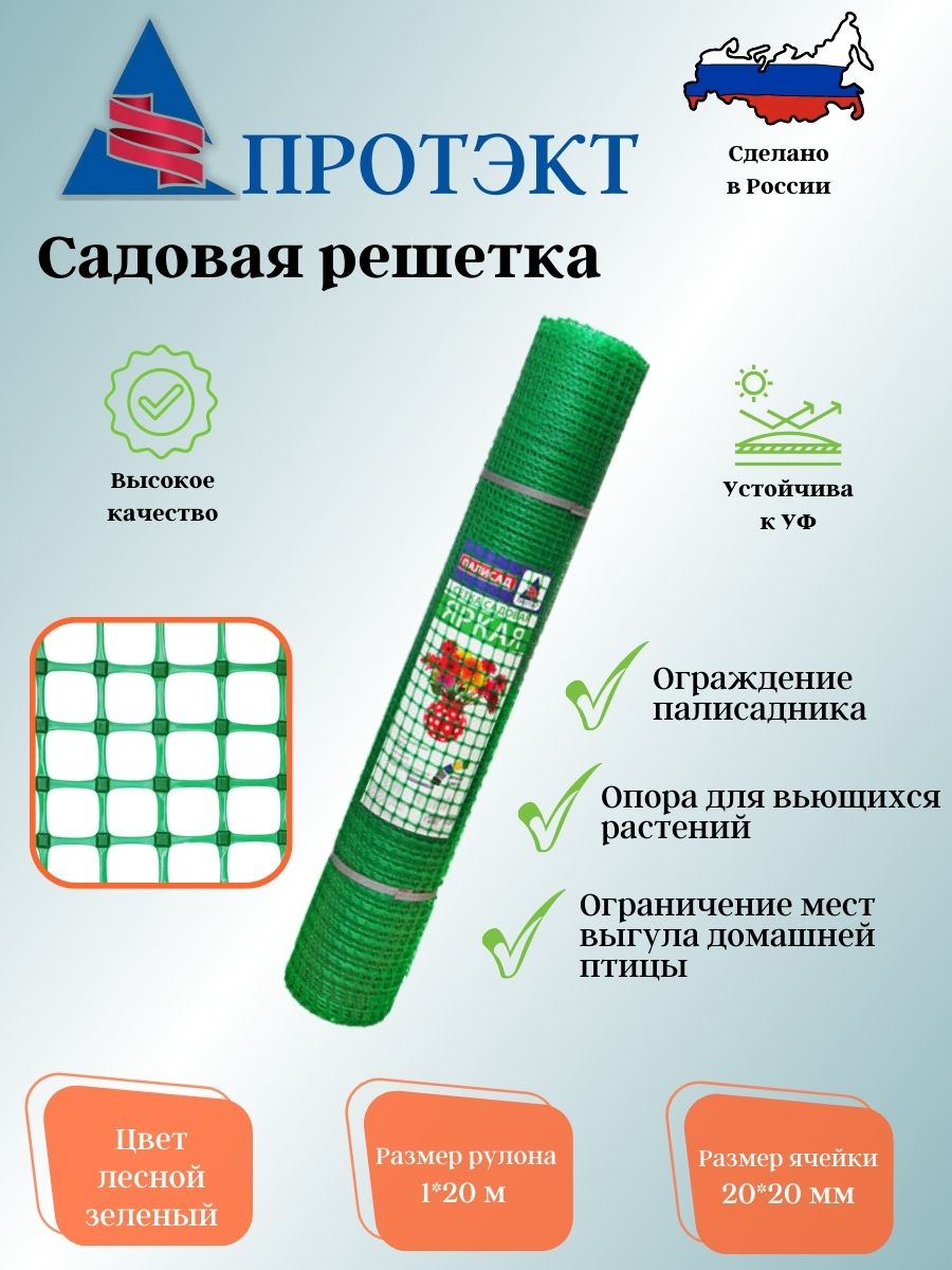 Пластиковая садовая решетка в рулоне ширина 1 м, длина 20 м, размер ячейки 20х20 мм, лесной зеленый - это удобный и практичный материал для создания заборов и ограждений в саду или на участке. Температурный режим эксплуатации от -30°С до +90°С. Эта сетка пластиковая легко монтируется, она очень прочная и не подвержена коррозии и ржавчине. Сетка садовая поможет вам справиться с любыми декоративными работами на участке. Газонная решетка в рулоне имеет небольшой вес, поэтому легко транспортируется, компактно хранится, быстро устанавливается. Используя изделие, как заборчик для клумбы, вы не скроете дивное цветение растений.