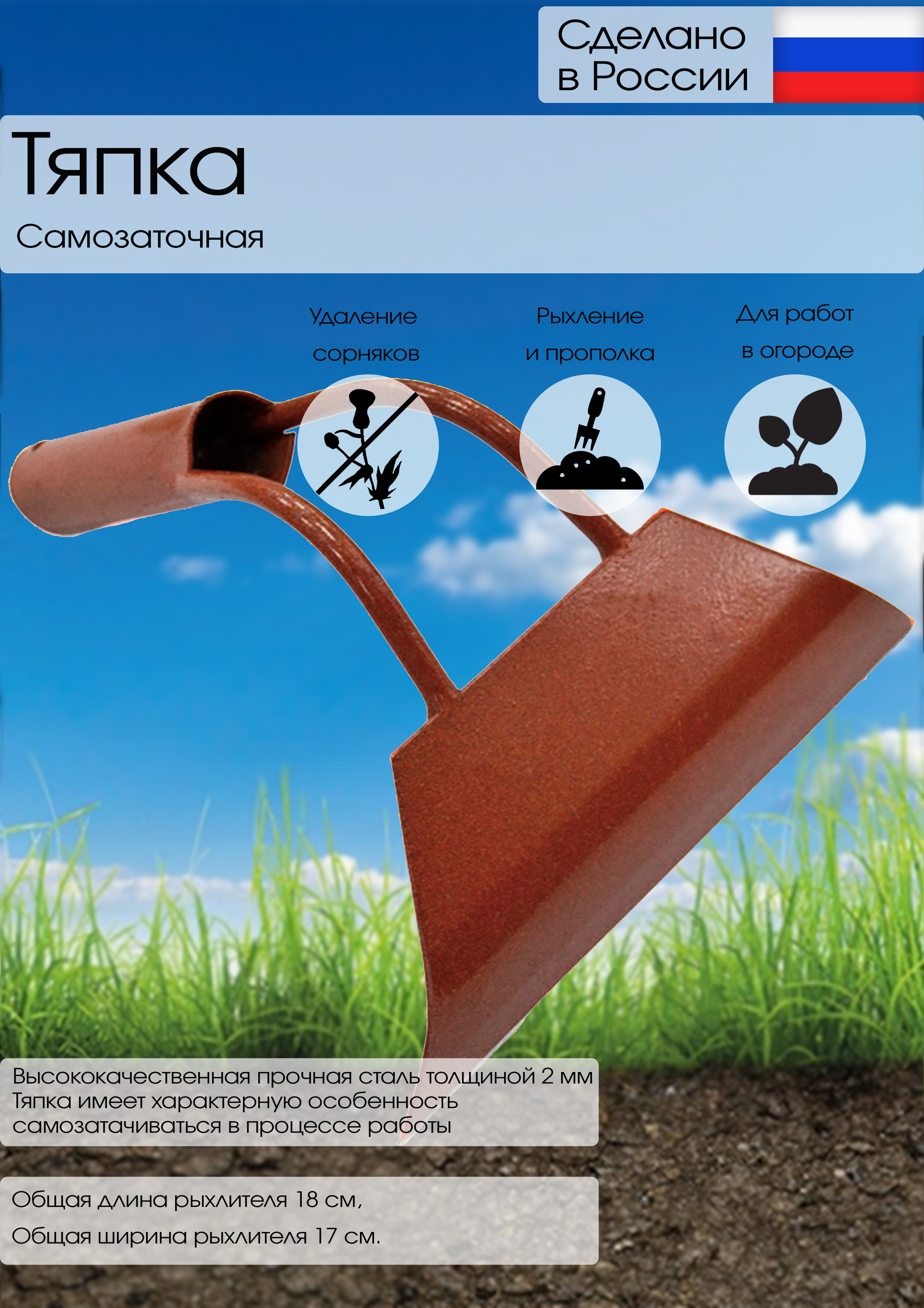 Тяпка обладает главной характерной особенностью самозатачиваться в процессе работы. Рабочая часть инструмента выполнена из высококачественной закаленной стали, благодаря чему тяпка обладает особой прочностью и надежностью.