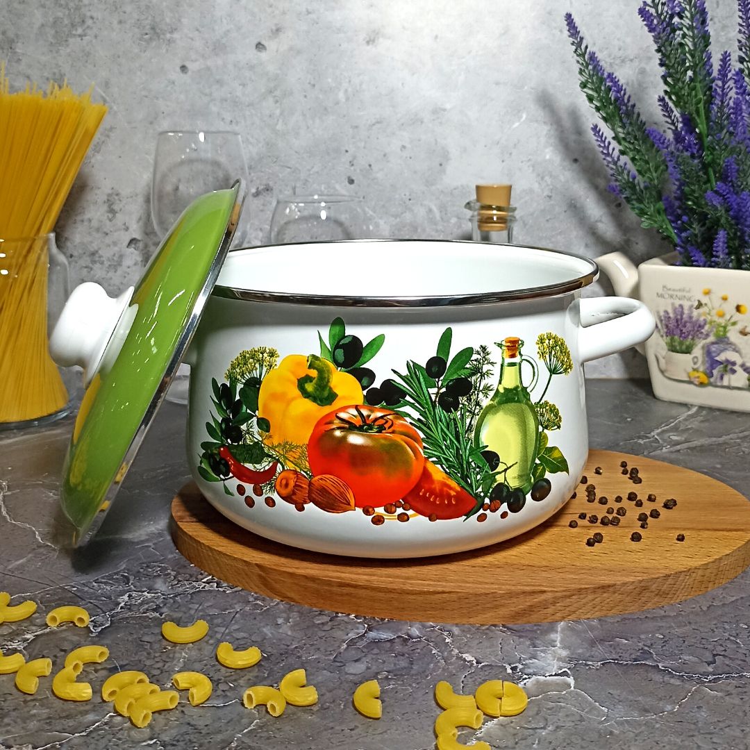 Посуда Стальэмаль рассчитана на длительный срок эксплуатации. Она подходит для любых видов плит и посудомоечных машин. Прочный корпус из холоднокатаного стального проката гарантирует эффективную тепловую обработку пищи. Благодаря двойному слою эмалевого покрытия исключается проникновение в пищу оксидов металла. Покрытие инертно и устойчиво к пищевым кислотам, не вступает во взаимодействие с продуктами и не искажает их вкусовые качества. Эмалированная кастрюля практична и долговечна. Пища не вступает в контакт с металлом, поэтому приготовленная еда будет не только вкусной, но и полезной. Можно готовить на плитах любого типа. Эмалированную посуду легко мыть, в том числе в посудомоечной машине. На дне изделий без ободка допускаются «точки» - следы от иголок, на которые изделие ставится и обжигается в печи. На изделиях с ободком таких следов нет, т. к. для обжига они ставятся вверх дном, а борт затем закрывается ободком из нержавеющей стали.