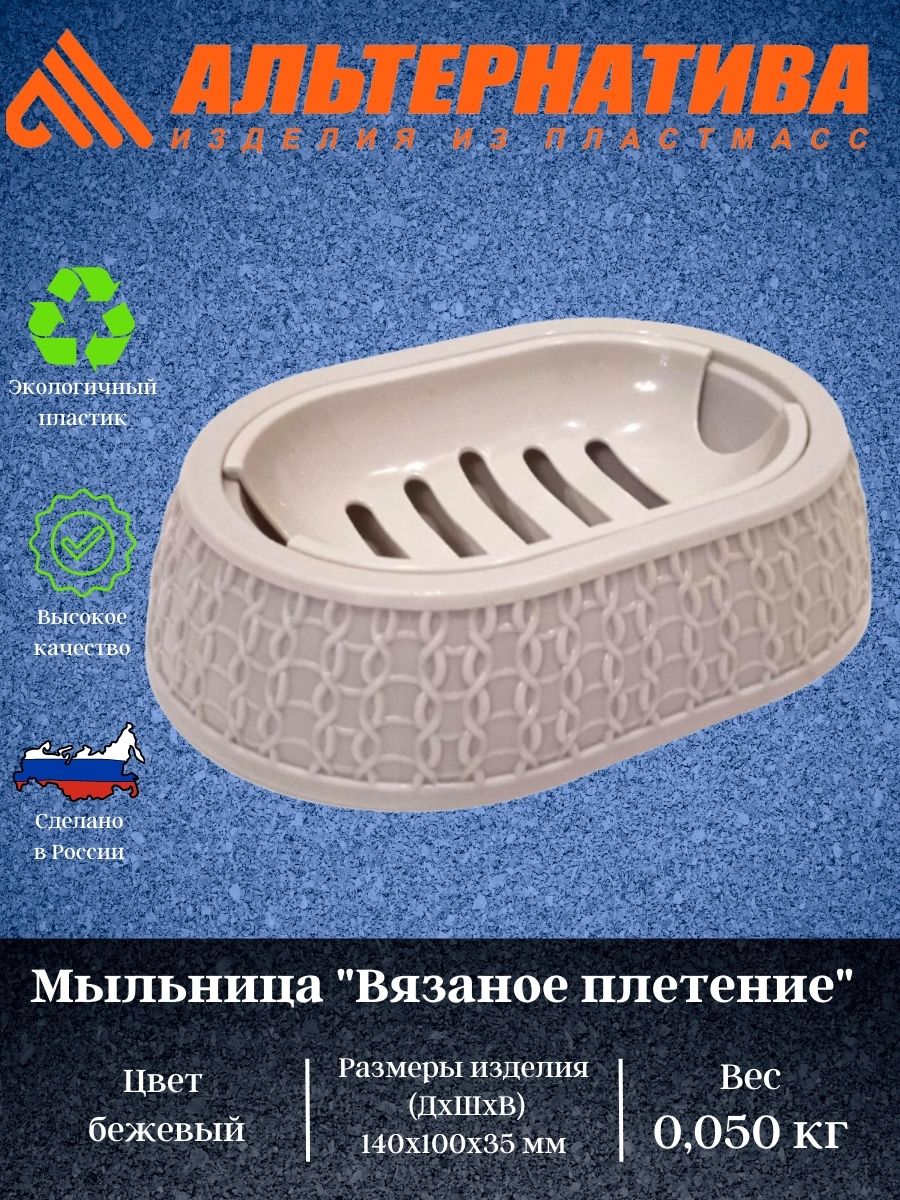Мыльница серии «Вязаное плетение» произведена из высококачественного полипропилена. Мыльница идеально подходит для хранения мыла. Мыльница имеет съёмную вставку с отверстиями, которые позволяют воде стекать, не давая мылу размокнуть. Оригинальный внешний вид задает поверхность, имитирующая вязаное плетение.