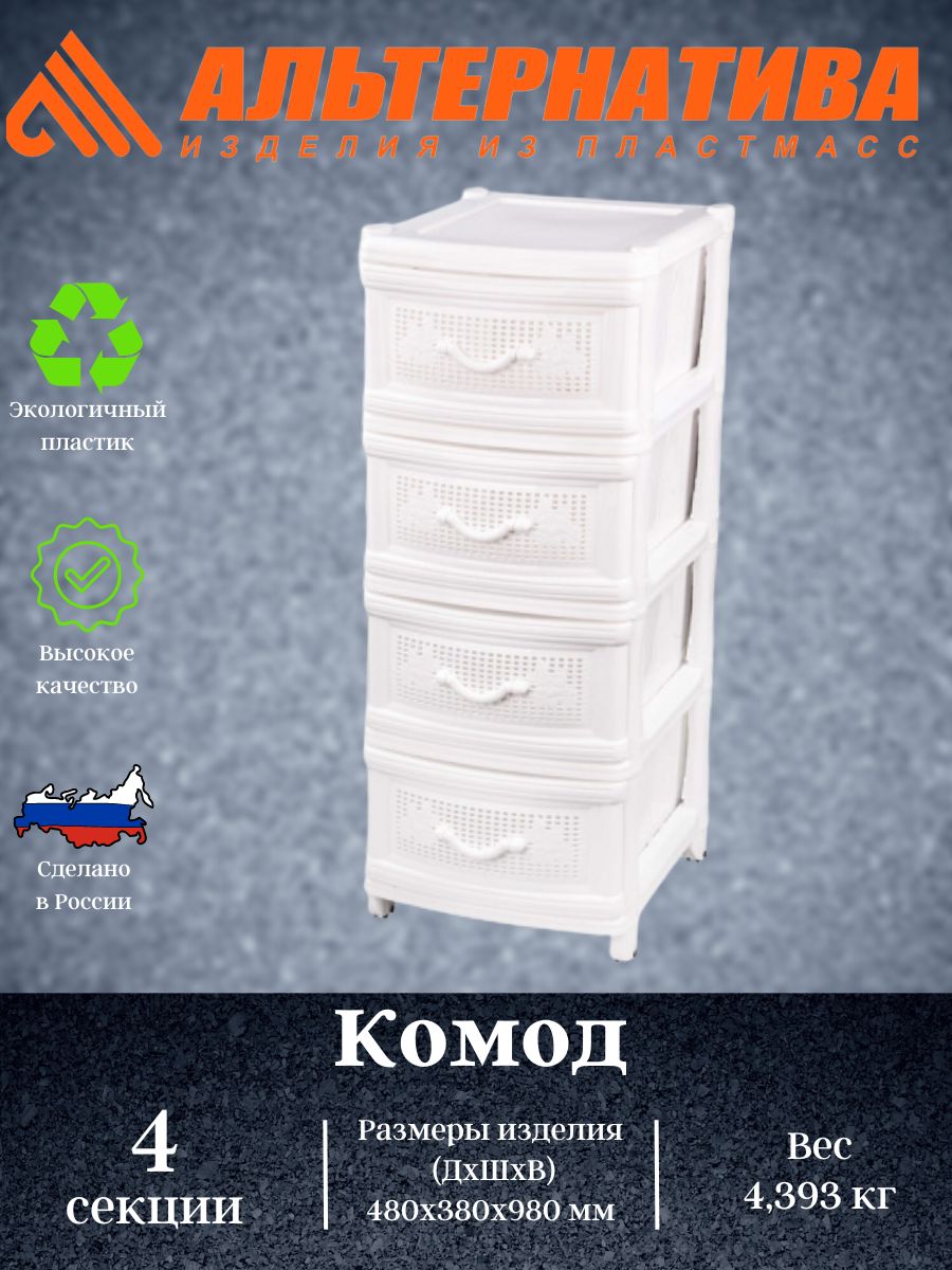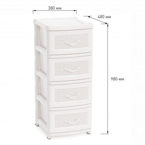 Комод пластиковый для одежды из высококачественного и безопасного полипропилена. При производстве используется только сертифицированное и экологически чистое, качественное сырье отечественных и зарубежных производителей. Комод прочный, имеет цельную конструкцию перегородок. Комод с ящиками, ящики выдвижные и достаточно вместительные. На крыше и перегородках предусмотрены ограничители, благодаря которым ящик не будет выпадать при открывании.