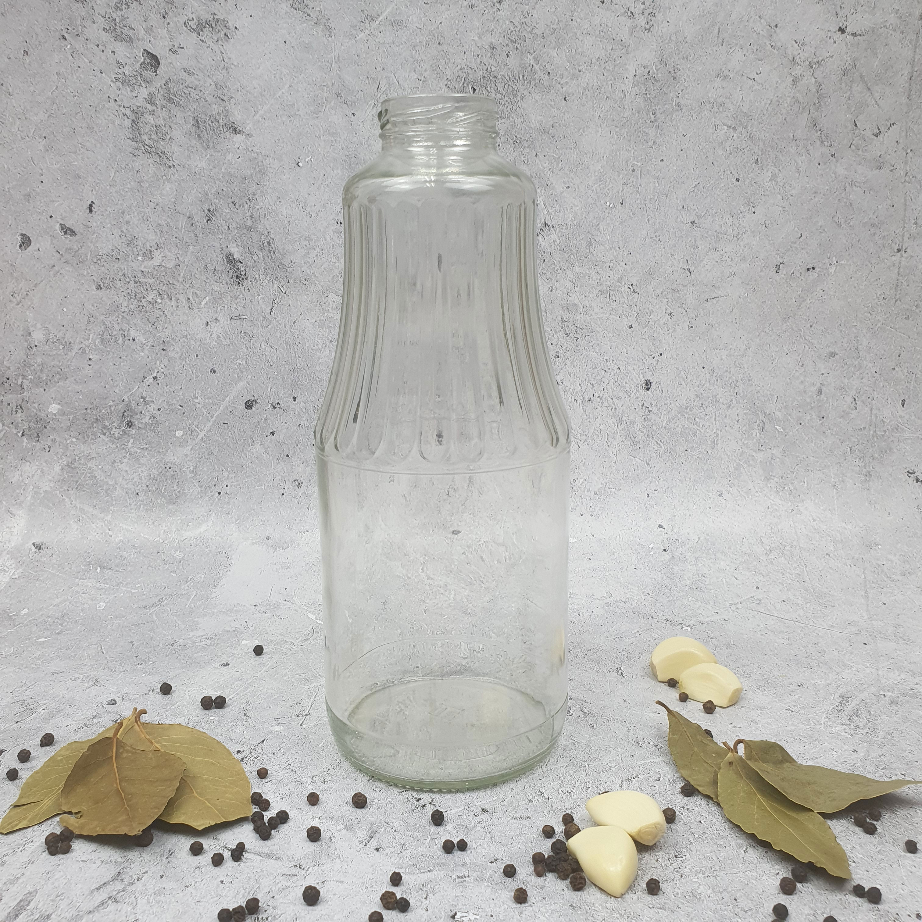 Стеклянная бутылка имеет объем 1000 мл, что позволяет хранить в ней различные напитки, такие как вода, соки, молоко и другие.