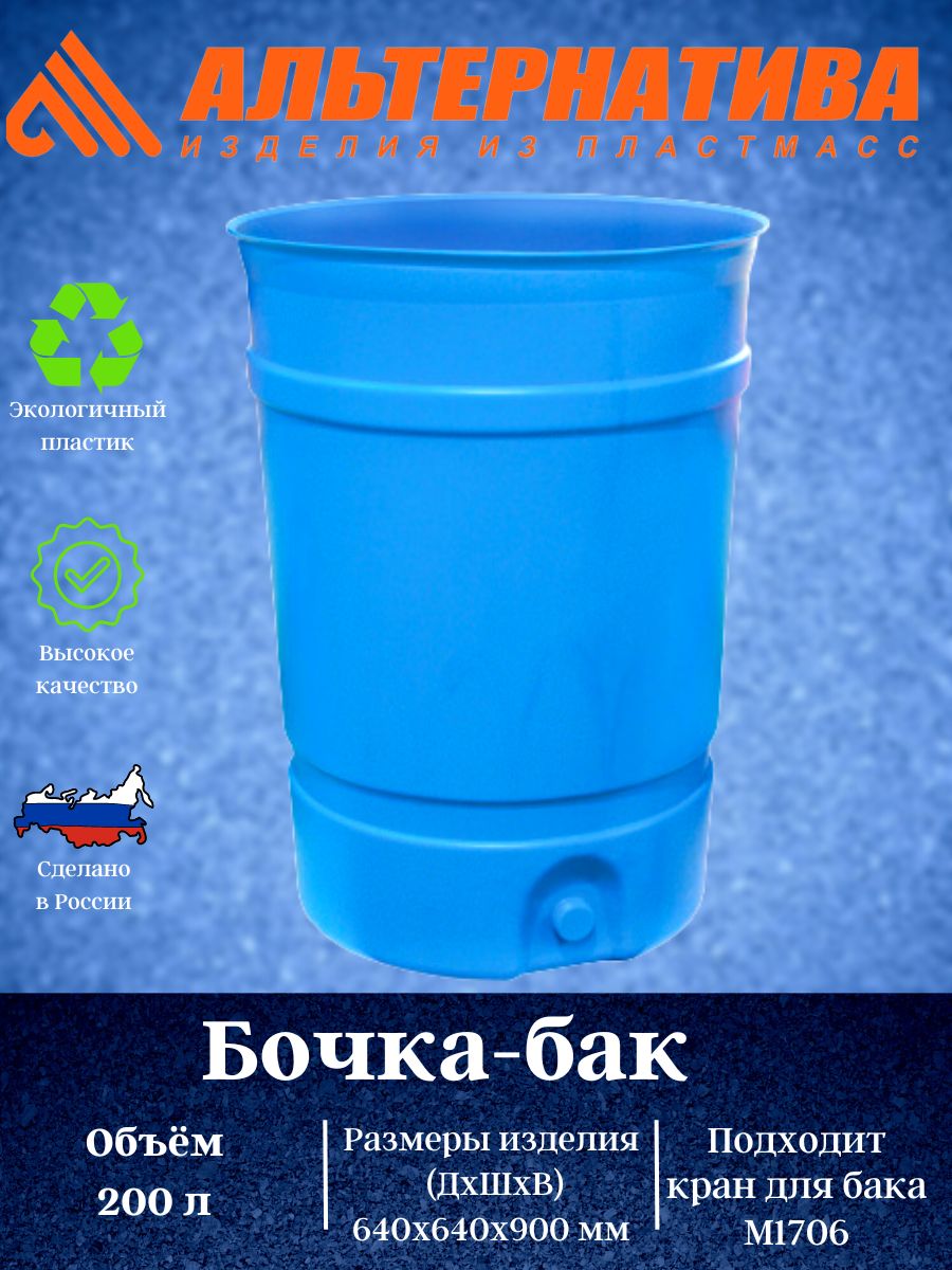 Изделие предназначено для накопления и хранения воды на дачных и приусадебных участках с целью дальнейшего полива. Бак также может использоваться для сбора дождевой воды, для компоста. На бочке имеется заглушенное отверстие для крана, который при необходимости легко установить самостоятельно. Подходит кран для бака М1706. Изделие изготовлено путем выдувного формования.